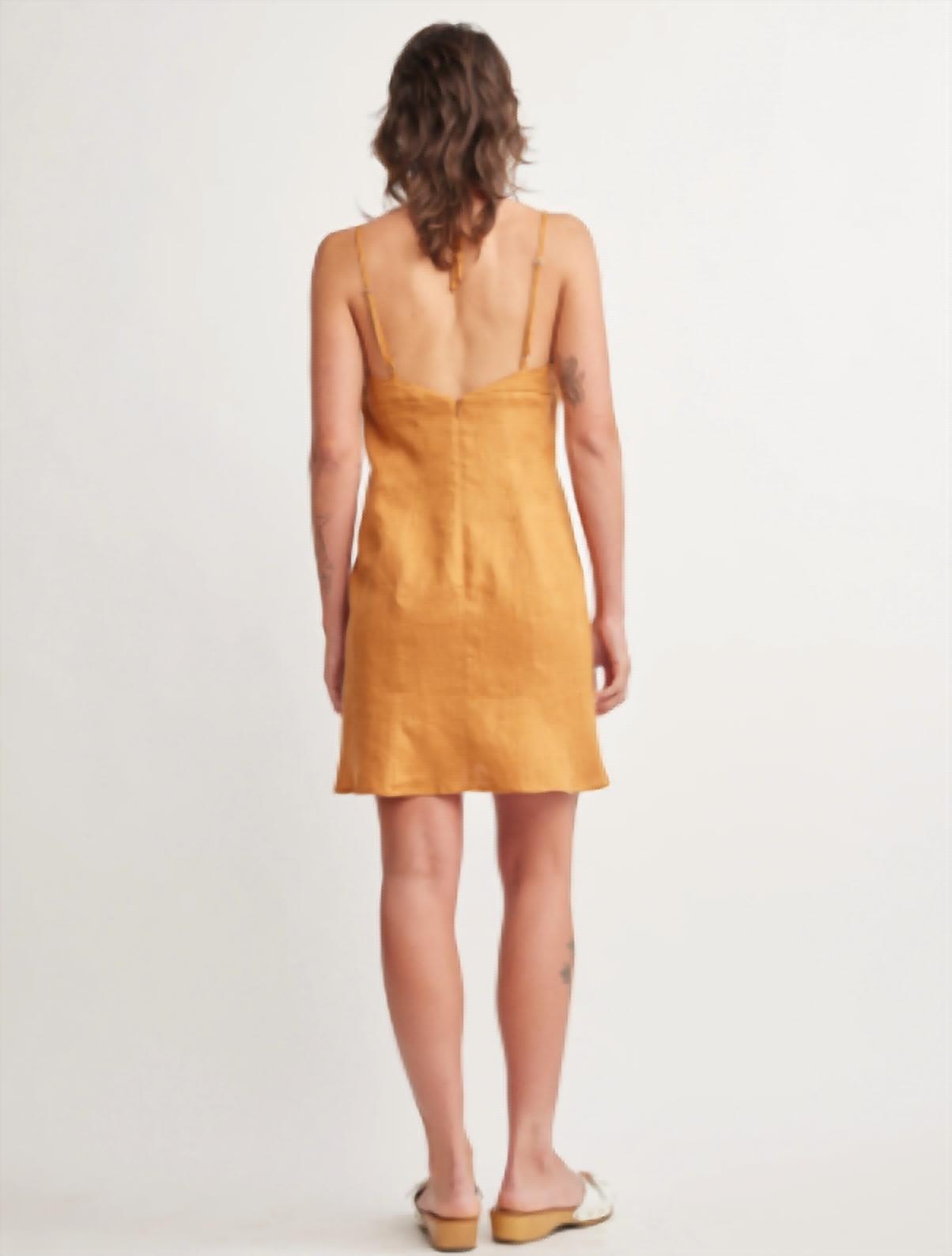 A short and breezy dress for those warmer days. The Anais Adjustable Straps Mini Dress by Self Contrast is your perfect companion for sun-kissed adventures. Featuring spaghetti straps, this dress is crafted from a breathable blend of 55% linen and 45% cotton for a relaxed mini-length fit. With a deep V-neckline and underbust seam detail, it enhances a feminine silhouette effortlessly. Closure: Tie closure. Care: Machine washable. The solid maple hue makes it a versatile pick for any spring event or 90s fashion enthusiast.