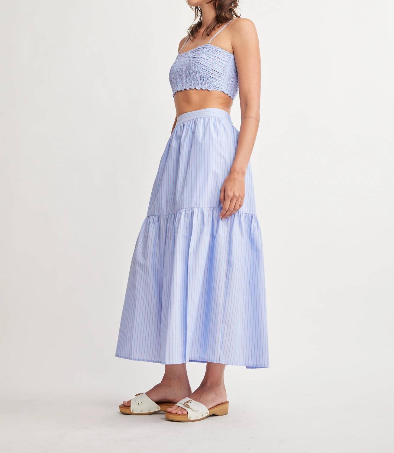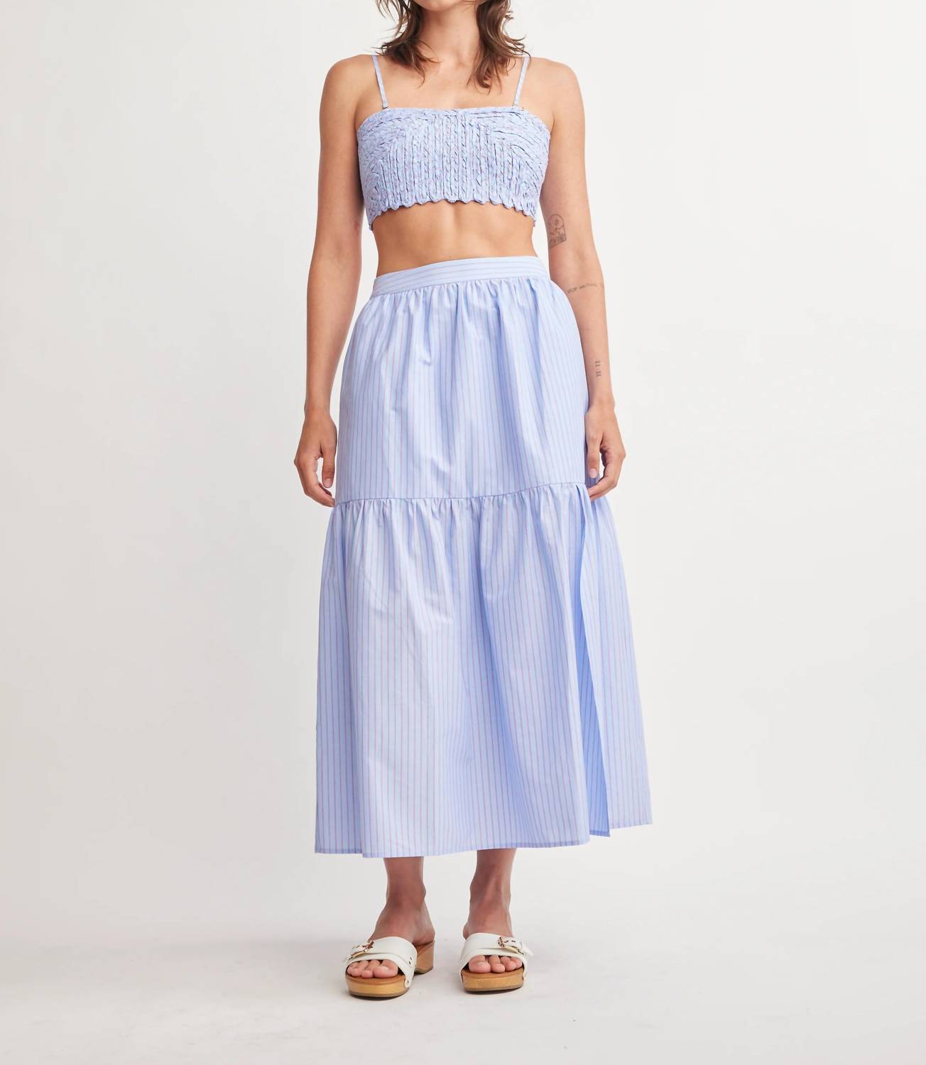 Tuck your favorite tee into this midi length skirt for an effortlessly cool look. Elevate your vacation style with the Rain Front Slit Midi Skirt by Self Contrast, featuring a light blue and white stripe pattern that embodies minimalist elegance. This women's skirt is crafted from 100% cotton, ensuring breathability and comfort, with a tiered silhouette and a subtle front slit for added movement. The pull-on elasticized waistband offers ease and adaptability, making it a versatile choice for both casual and elevated looks. Care: Machine wash and tumble dry for easy maintenance.