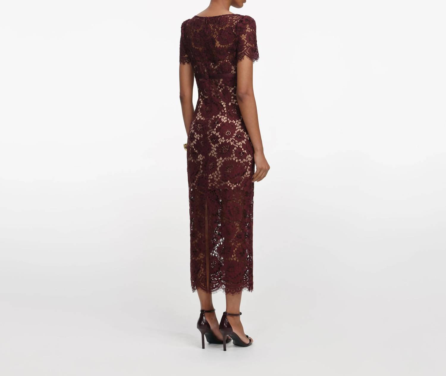 A midi dress so versatile, your options for wearing it are endless. Introducing the Floral Lace Midi Dress by Self-Portrait, a refined piece in burgundy that's perfect for evening events. This short sleeve dress features an elegant sheath silhouette and V-neckline, crafted from a nylon blend with a delicate floral pattern. Closure: Concealed side zipper. Care: Machine wash. A refined bow motif adorns the front, adding charm to this exquisite fall garment. 63% Polyamide, 27% Cotton, 10% Viscose | Skirt: 48.5% Nylon, 28.2% Cotton, 23.3% Rayon | Lining: 100% Polyester.