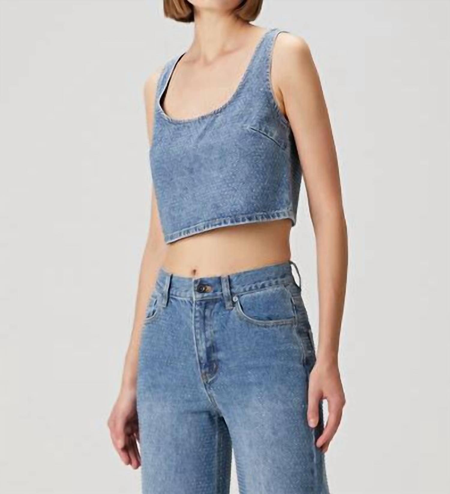 Show a little skin in this cute and casual crop top. Elevate your summer look with the Rhinestone Denim Crop Top by Self-Portrait, a must-have for streetwear style at cocktail parties. This sleeveless top, tailored from solid denim, features a chic scoopneck design in a trendy blue hue. Closure: Zip closure. Care: Dry clean only.