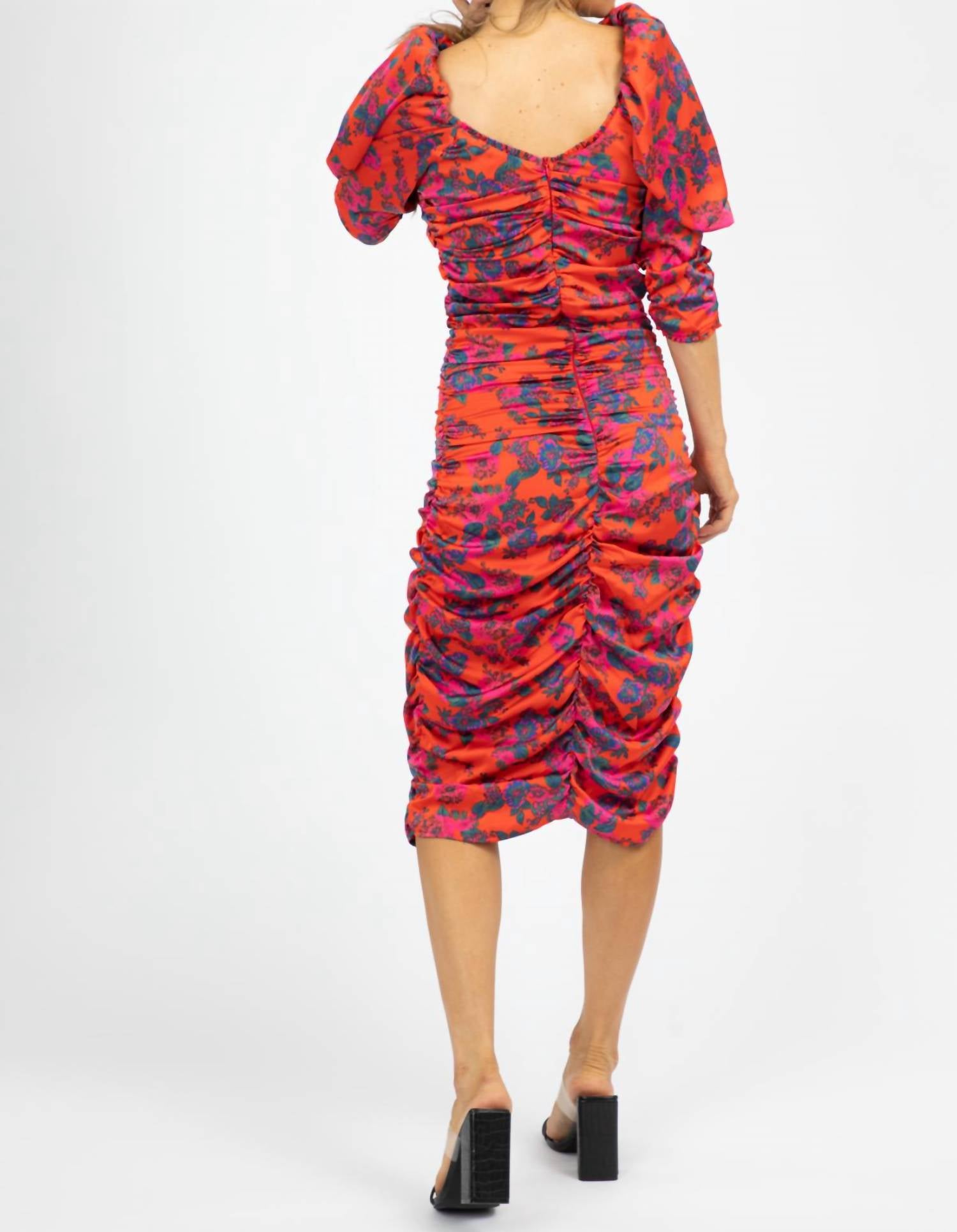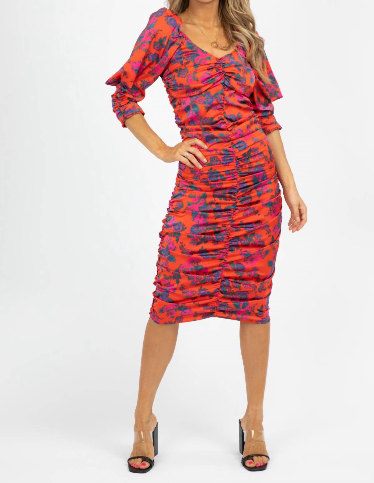 The perfect length dress does exist. Introducing the Ruched Floral Midi Dress by Shampoo, a striking piece in vibrant red designed for women who love to make a statement. This bodycon silhouette features three-quarter puffed sleeves with a flattering ruched detail and a sophisticated V-neck. Crafted from an 89% Nylon and 11% Elastane body with a 100% Polyester lining, this dress is all about elegance and comfort. Closure: Zip closure. Model Naomie is wearing a size small (5'8" height, dress size 2).