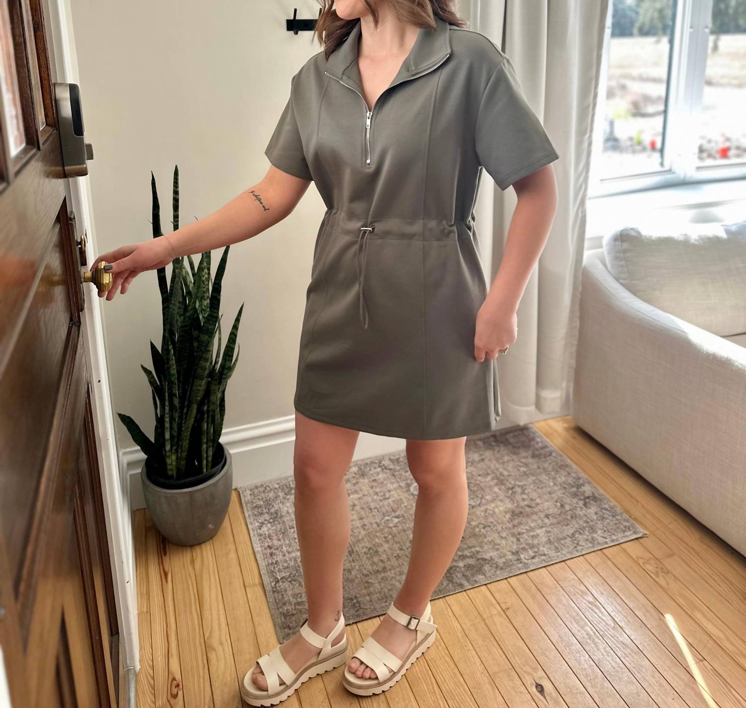 The perfect mini dress for those warmer months. Elevate your holiday wardrobe with the Essig Drawstring Knit Mini Dress by She + Sky, a stunning piece in olive for a minimalist and sporty look. This dress, featuring a collared neckline, short sleeves, and a practical drawstring waist, offers a casual yet chic silhouette. Made from a comfortable cotton blend, with 55% cotton, 37% polyester, and 8% spandex, this mini dress has convenient pockets and falls above the knee. Available in sizes S (2-4), M (6-8), and L (10-12), this pull-on dress is perfect for your next holiday party.