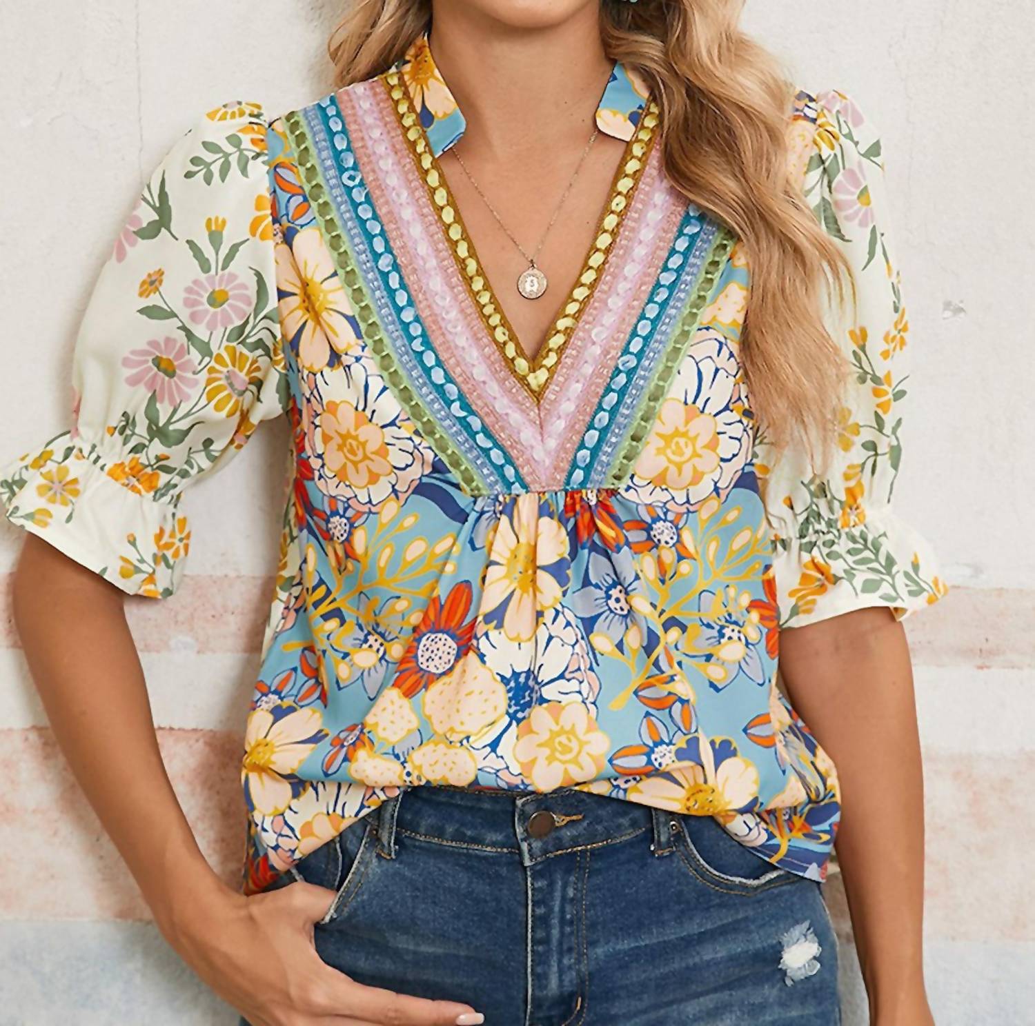 Pair this with your favorite jeans and slides for your next girls night out. Capture the essence of retro fashion with the Daphne Retro 70's Floral Top by Shewin, a vibrant addition in Multi Blue that compliments any wardrobe. This blouse flaunts elbow-length puff sleeves and a playful V-neck, crafted from durable polyester. Closure: Simple pull-on style. Care: Hand wash and line dry for best results. Perfect for a boho chic look this spring, whether you're dressing for a vacation or a Valentine's Day event.