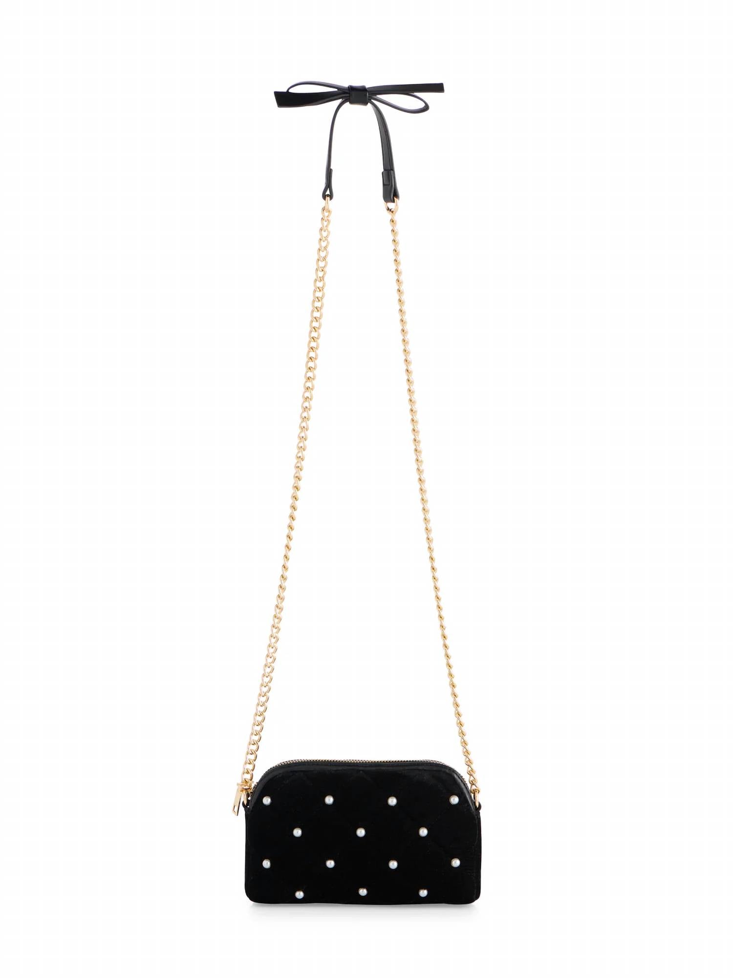 A casual and cute take on everyone's favorite crossbody bag. he Aimee Cross-Body is your new go-to glam piece for nights out and dressed-up days. Made with plush black velvet and topped with faux pearl accents, it’s the perfect mix of timeless and trendy. Featuring a sleek top zip closure, chic gold chain strap, and a handy inner slip pocket, this compact bag keeps your essentials close without sacrificing style. It’s just the right size for your phone, lipstick, and a little extra sparkle. Measures L 8” x W 1.5 ” x H 5”; Chain 22.5”