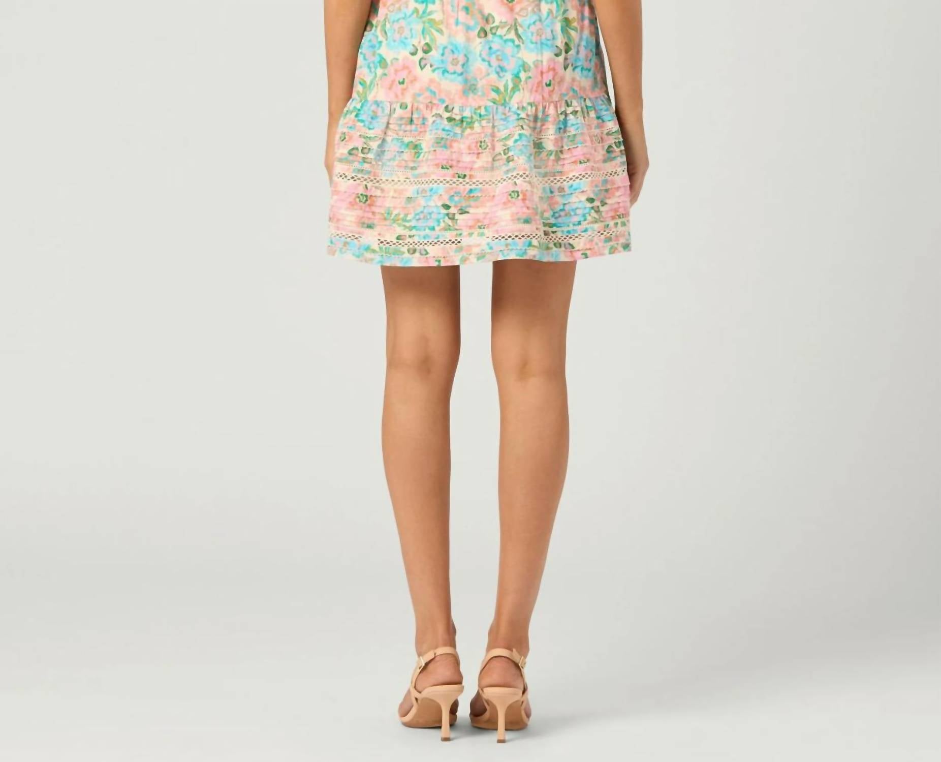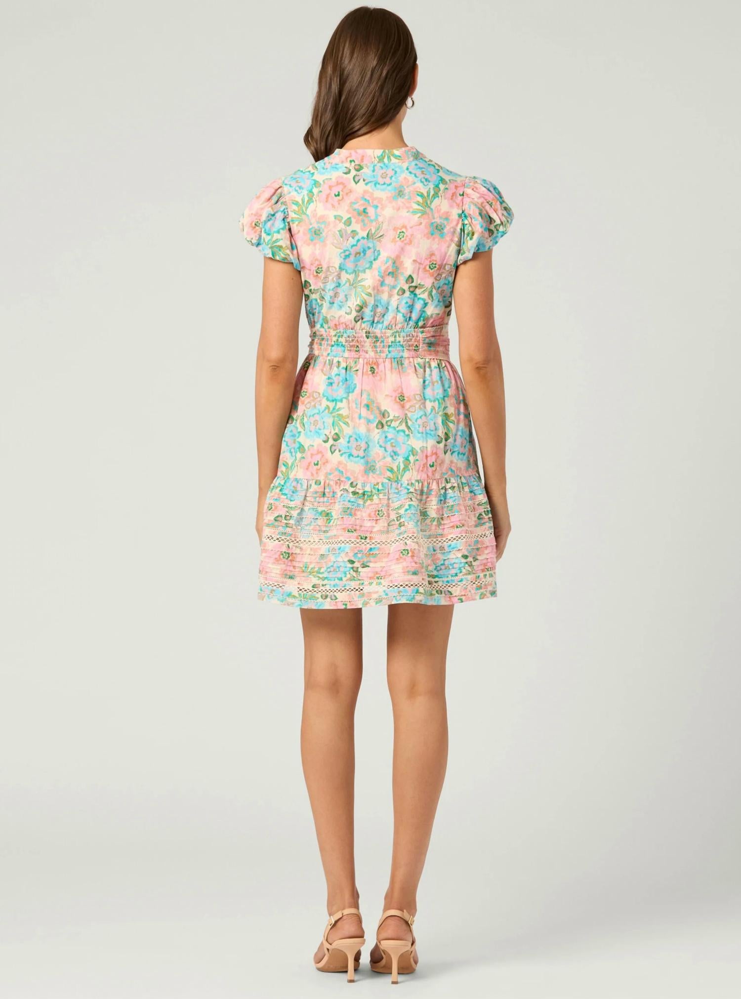 The perfect mini dress for those warmer months. Introducing the Cecelia Dress by Shoshanna, a perfect embodiment of boho chic in a rose and ivory floral print. This summer dress features short puff sleeves, a v-neckline with a collar band, and a fitted bodice with elastic smocking at the back waist, enhancing its fit and flare silhouette. Crafted from 100% cotton and fully lined, it boasts intricate pintuck details and delicate trim along the A-line skirt, with belt ties and gold D-rings for a custom fit. Closure: Button closure. Care: Dry clean. Ideal for vacation or Easter occasions.