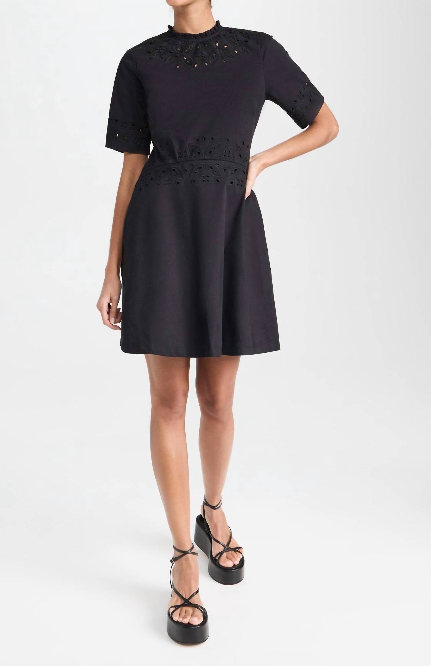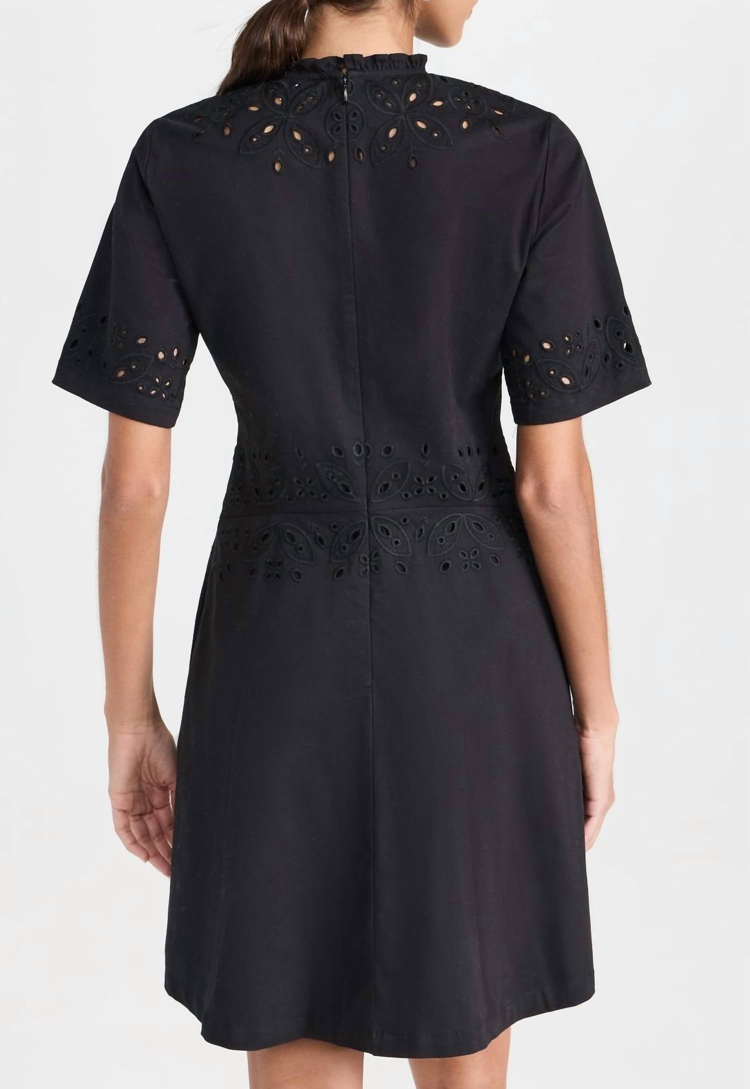 The perfect mini dress for those warmer months. Introducing the Hazel Dress by Shoshanna, a chic mini dress crafted from a cotton blend with a soft A-line silhouette. This piece features short sleeves, a jewel neckline, and eyelet trim, adding a touch of elegance to the design. Made from 98% cotton and 2% elastane, the dress offers minimal stretch for a snug fit. Originating from China, it boasts a convenient zip closure with hook-and-eye detail, on-seam side pockets, and measures 35 inches in length. Care for this mid-weight stretch poplin by dry cleaning only.