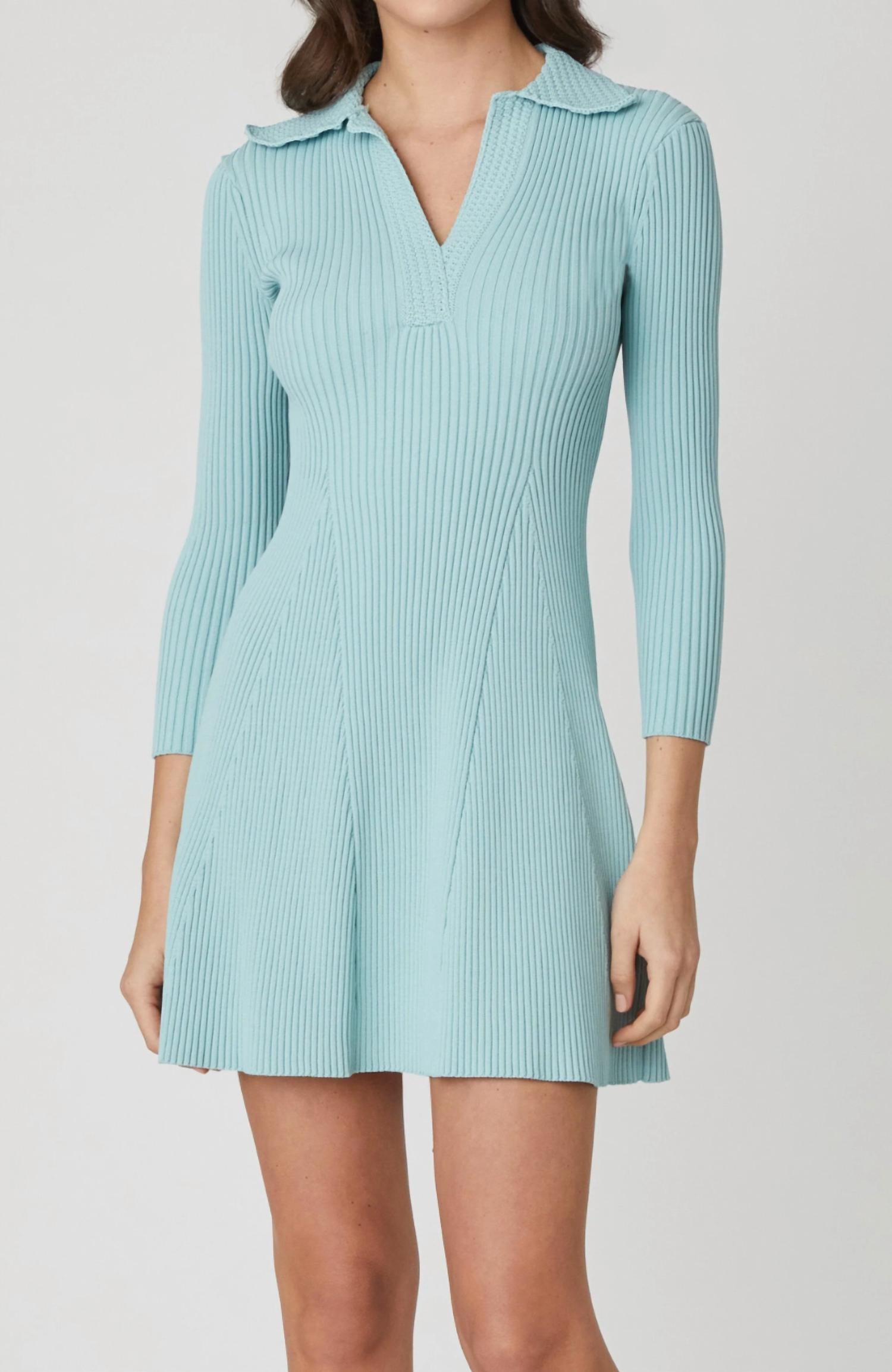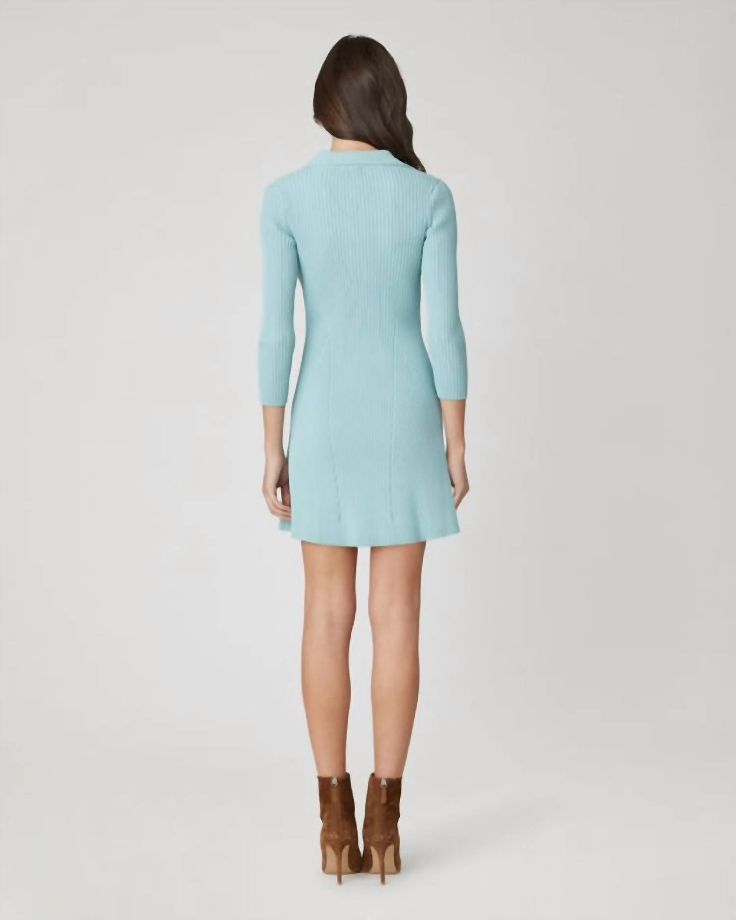 A short and breezy dress for those warmer days. Introducing the Robin Knit Mini Dress by Shoshanna in an elegant Mist hue, an ideal choice for spring celebrations. This dress comes with long fitted sleeves and boasts a bodycon fit with a fit and flare silhouette, crafted from a ribbed knit blend of 65% Viscose and 35% Nylon with Lycra. The garment is unlined with a convenient pull-on closure. Care instructions include hand wash and line dry for best results.