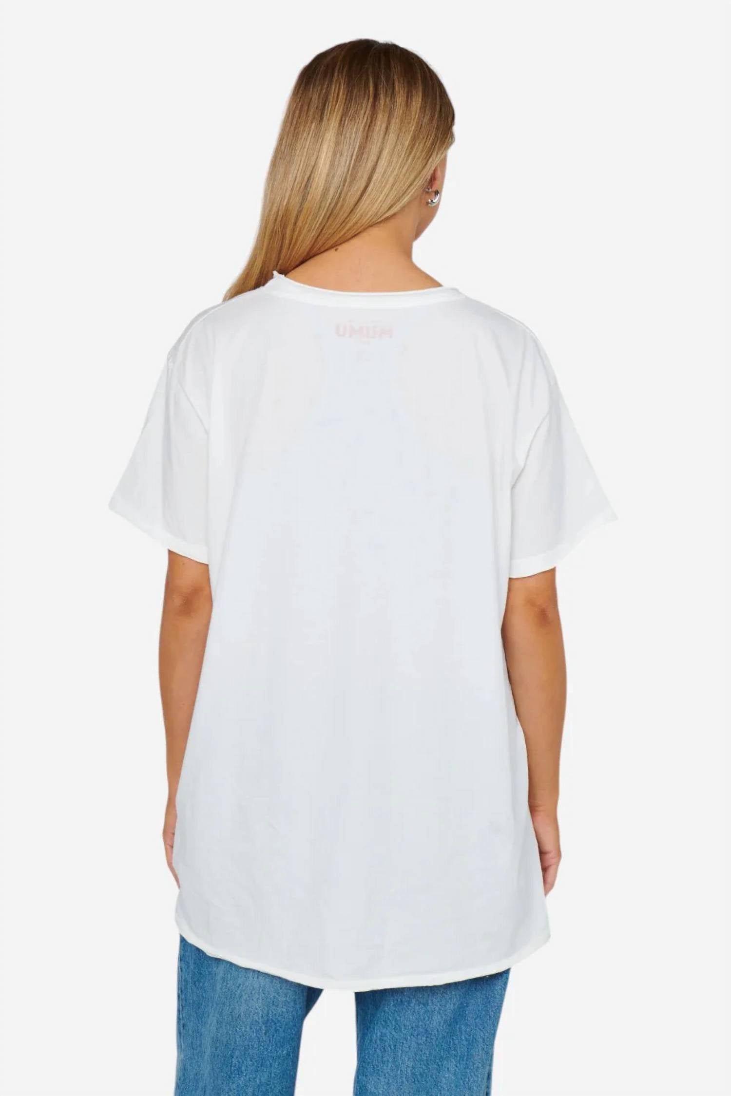 The short sleeve tee you'll want in every color. Add a playful touch to your wardrobe with the Show Me Your Mumu Airport Tee in Heartbrake Hotel White. This classic graphic tee, crafted from 100% cotton, features a short sleeve design and an oversized silhouette. Made for casual outings, it boasts a crewneck and a convenient pull-on closure. Care for this tee is effortless with machine wash instructions and a lay flat to dry recommendation.