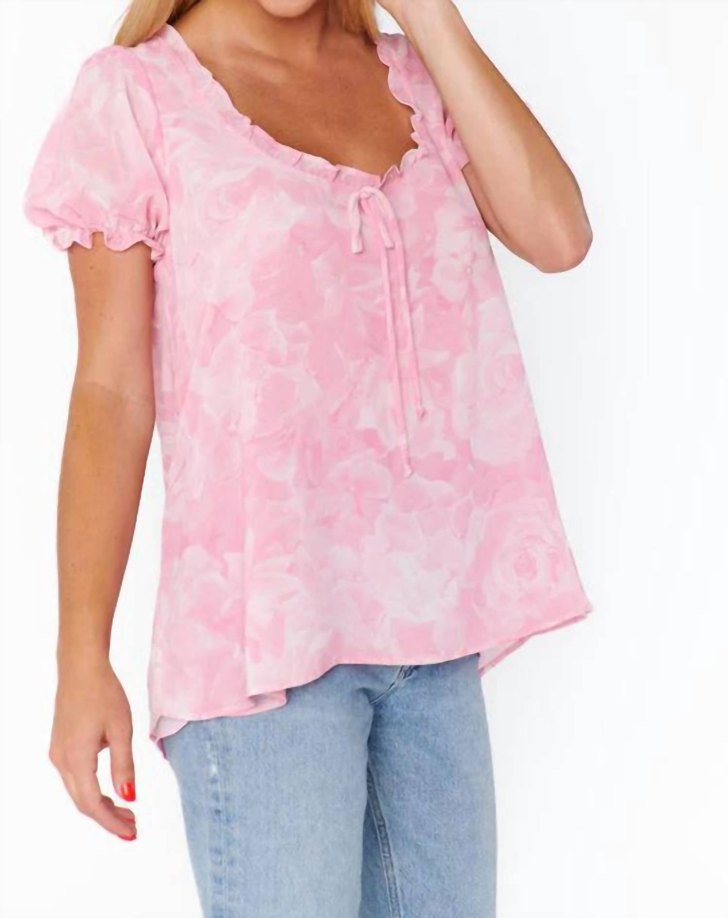 A timeless blouse that will never go out of style. The Brunch Top by Show Me Your Mumu is a perfect addition to your summer wardrobe, offering a blend of style and comfort. Featuring short sleeves and crafted from a lightweight, flowy fabric, it is ideal for warm summer days. The top showcases a chic floral pattern in soft pink, complemented by a V-neckline and front bow detail for a touch of elegance. With a convenient pull-on closure, this blouse is a stylish option for vacations, particularly fitting for a Valentine's Day outing.