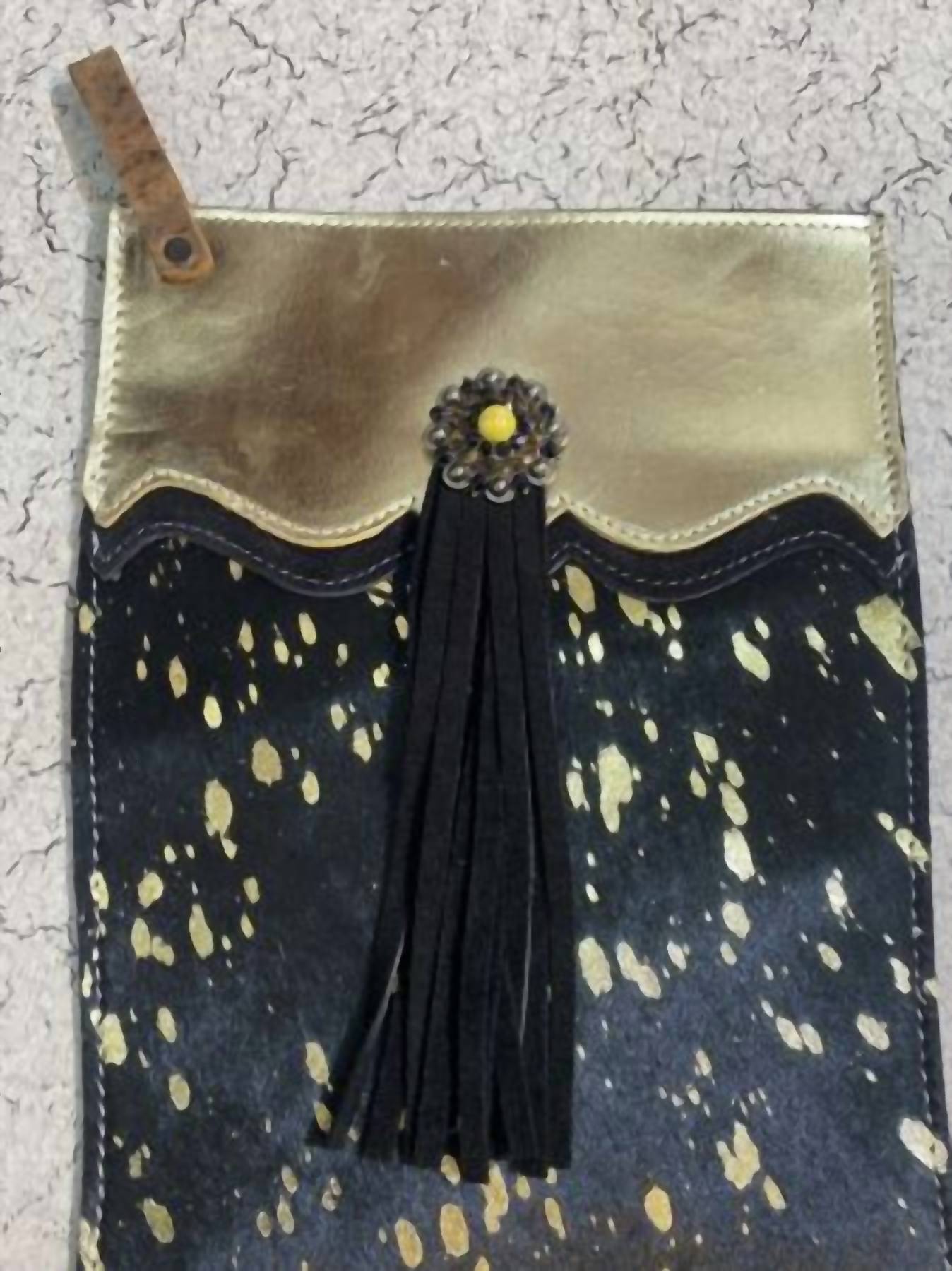 Introducing the Showman Gold Acid Wash Cowhide Leather Christmas Stocking, a statement piece designed to elevate your holiday decor. This unique stocking features a striking gold metallic acid-washed cowhide front with a complimentary gold leather cuff overlayed on black leather. Measuring 17 inches in length with a 13.5-inch foot length and 8.25 inches width at the top, it's both practical and eye-catching. Each stocking showcases unique cowhide patterns, complemented by a decorative yellow rhinestone concho and black suede leather fringe for a rustic touch.