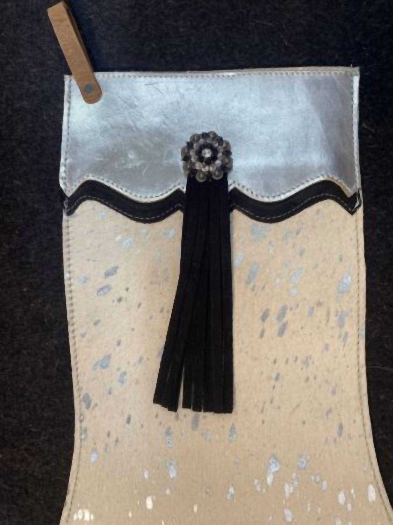 Introducing the Showman Silver Acid Wash Cowhide Leather Christmas Stocking, a striking addition to your holiday decor. Crafted with unique hair-on cowhide leather, this stocking features an eye-catching silver metallic acid wash front and a contrasting black suede leather back. Dimensions include a 17" length, 13.5" foot length, and 8.25" width at the top. The stocking boasts a decorative rhinestone flower concho with suede leather fringe, adding a rustic charm to your festive celebrations.