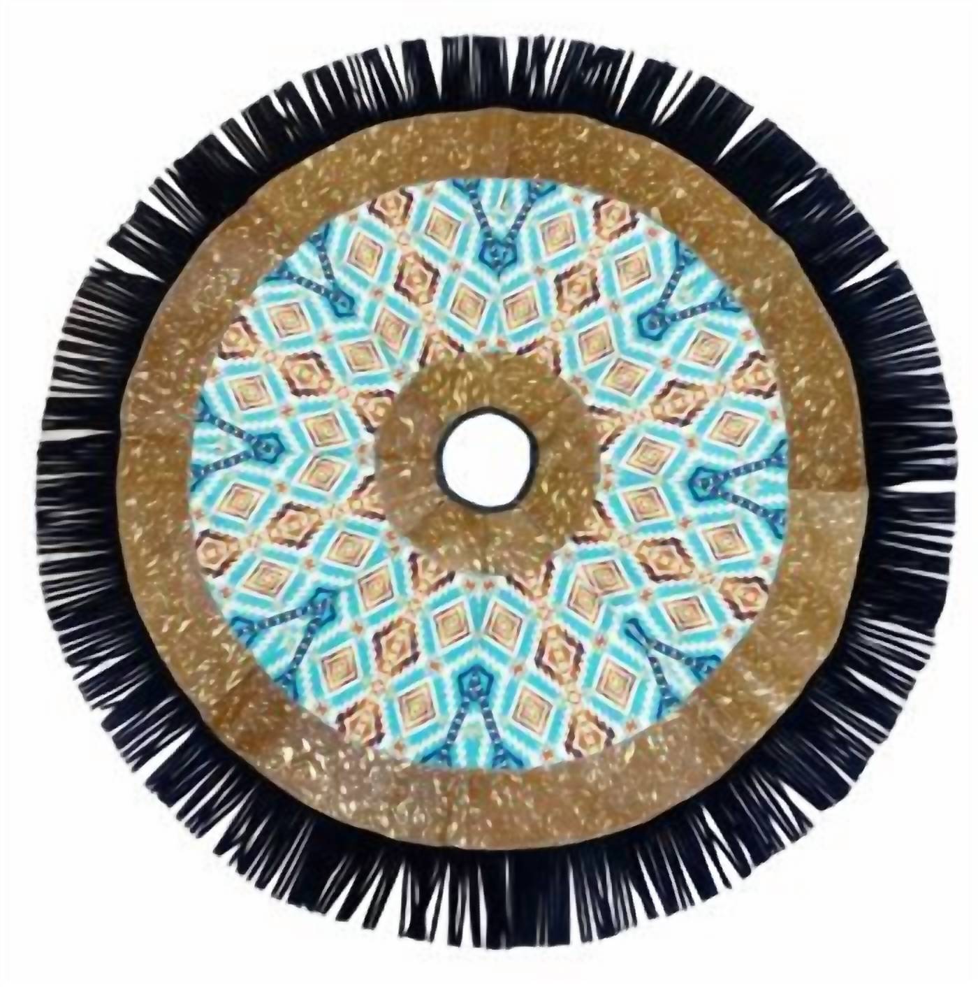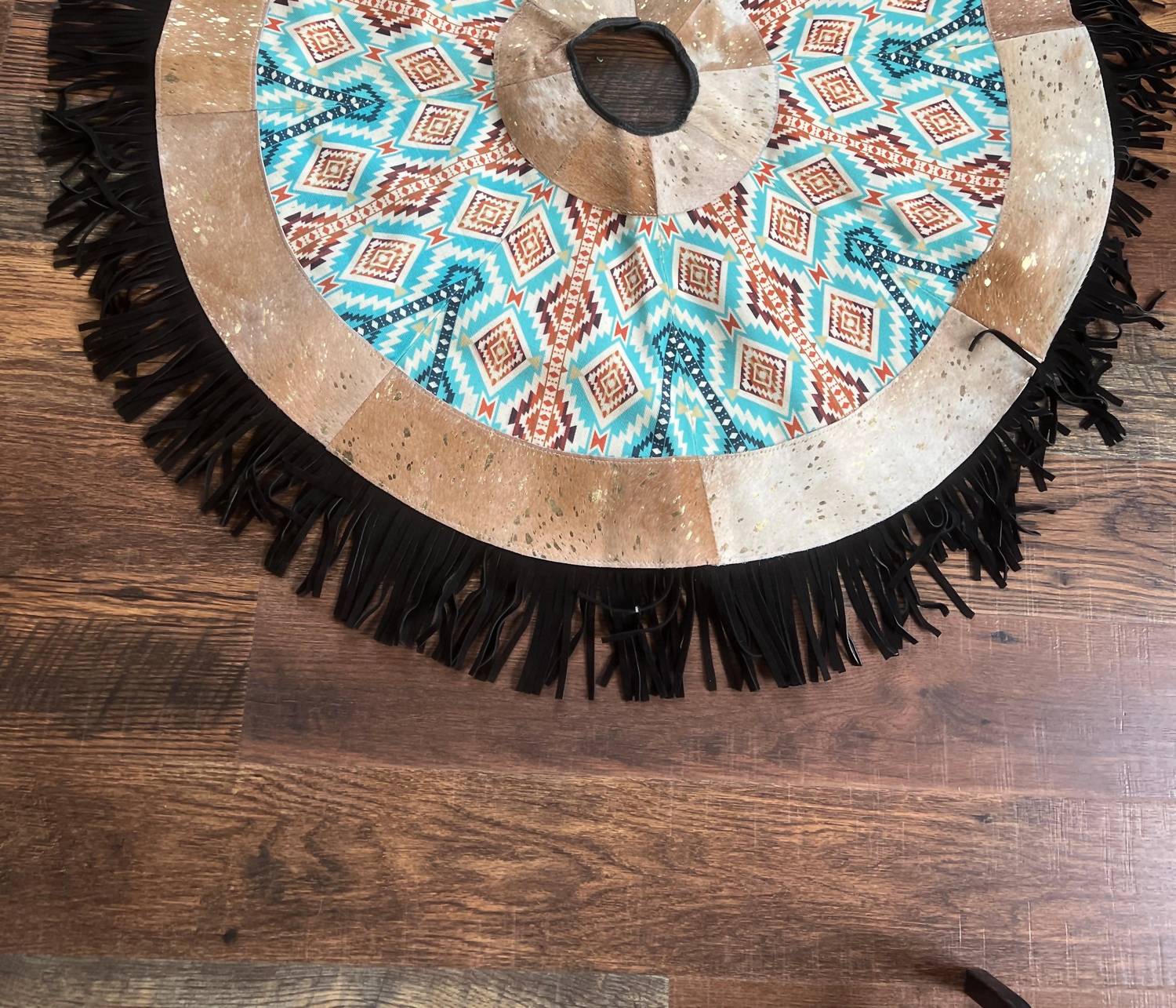 Introduce holiday elegance with the Showman Cowhide Leather Christmas Tree Skirt, featuring an Acid Wash Aztec Inlay design. Crafted from luxurious cowhide leather, this tree skirt stands out with its gold acid wash shimmer and vibrant teal, burgundy, orange, and white Aztec pattern. The skirt's black leather fringe and edge provide a refined finish, while the Velcro closure ensures a secure fit around your tree. Measuring 48 inches in diameter with a 4-inch fringe, this piece adds a unique and stylish flair to your holiday decor.