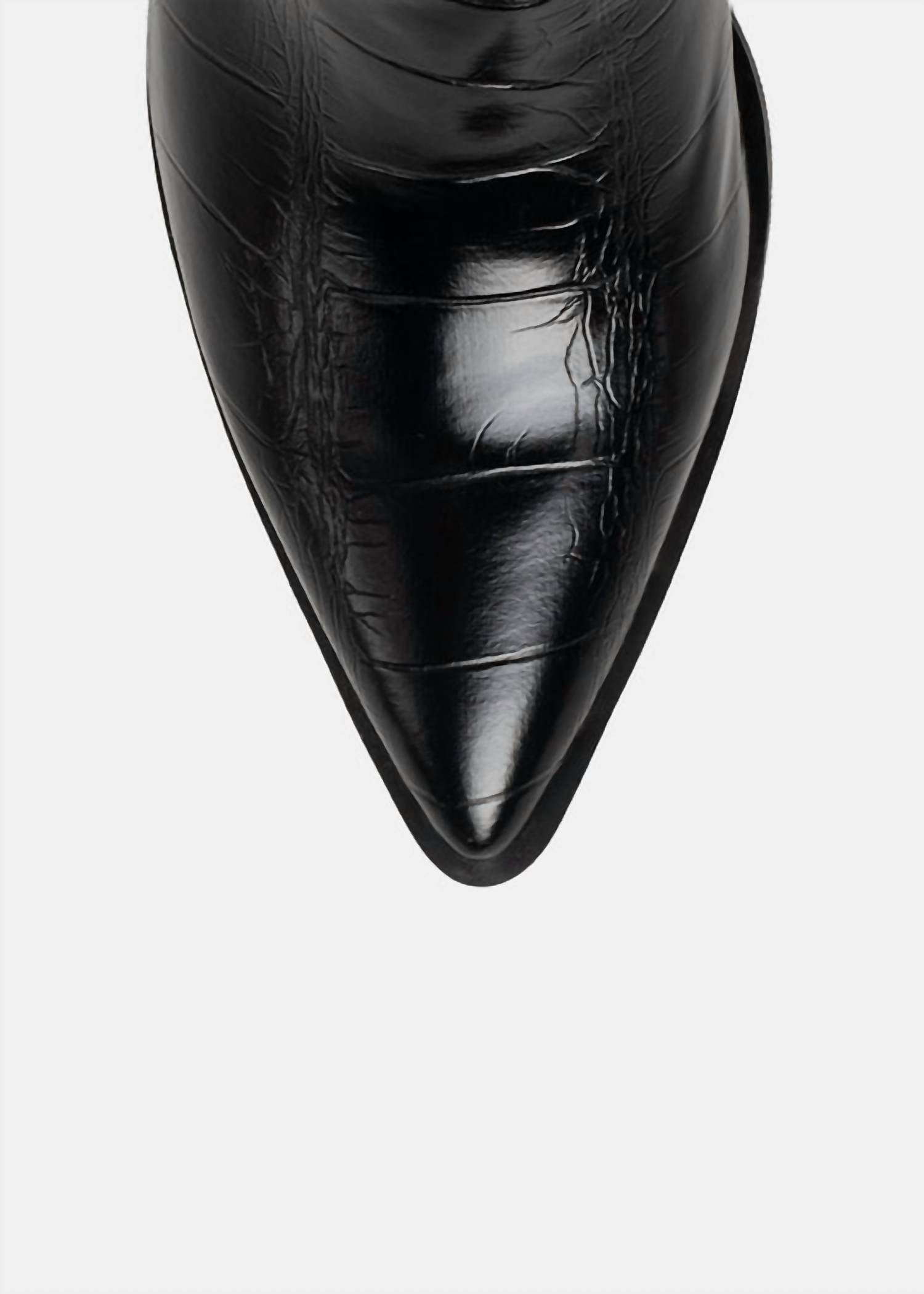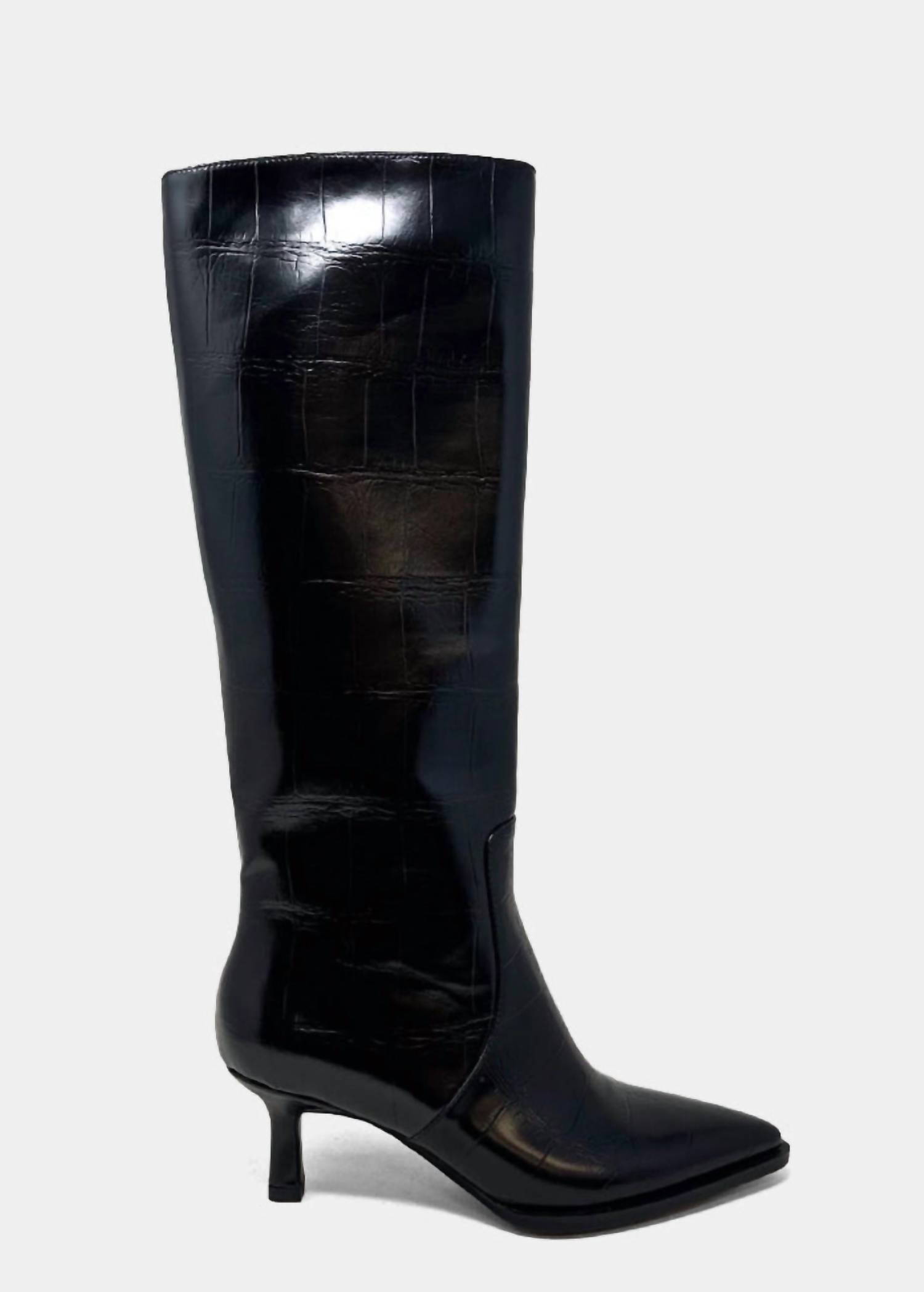 These over the knee boots are equal parts classic and cool. Enter the season in style with the Women's Vanessa Pointed Toe Knee High Kitten Boots by SHU SHOP in Black Faux Leather. Crafted from sleek faux croc-embossed leather, these boots feature a pointed toe and a 2.5" sculpted kitten heel for a touch of minimalist elegance. This knee-high boot, with its pull-on style and structured shaft, pairs beautifully with anything from tailored minis to wide-leg denim, making it perfect for holiday gatherings. Designed with a smooth synthetic lining and durable rubber sole, these boots offer both comfort and a modern edge.