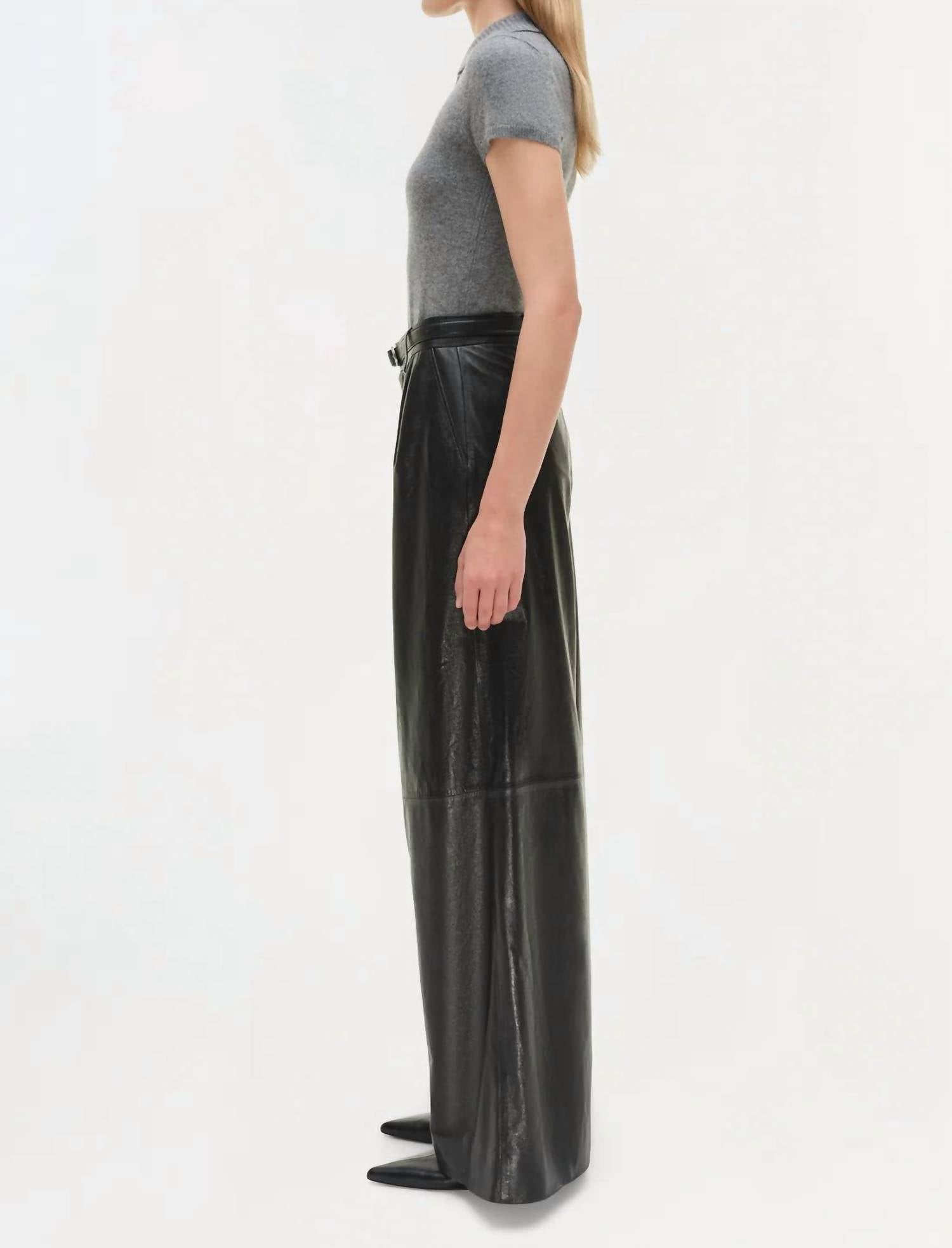 Introducing the SIMKHAI Kobie Wide Leg Leather Pant, an ideal choice for a minimalist yet sophisticated look at your next evening event. These regular fit pants are crafted from 100% lamb leather with a polyester lining, featuring a wide leg silhouette, banded waist, pleated front, and welt back pockets. The stylish solid black color and convenient zip closure make it perfect for fall occasions. Proudly imported, this piece blends exceptional craftsmanship with timeless elegance.