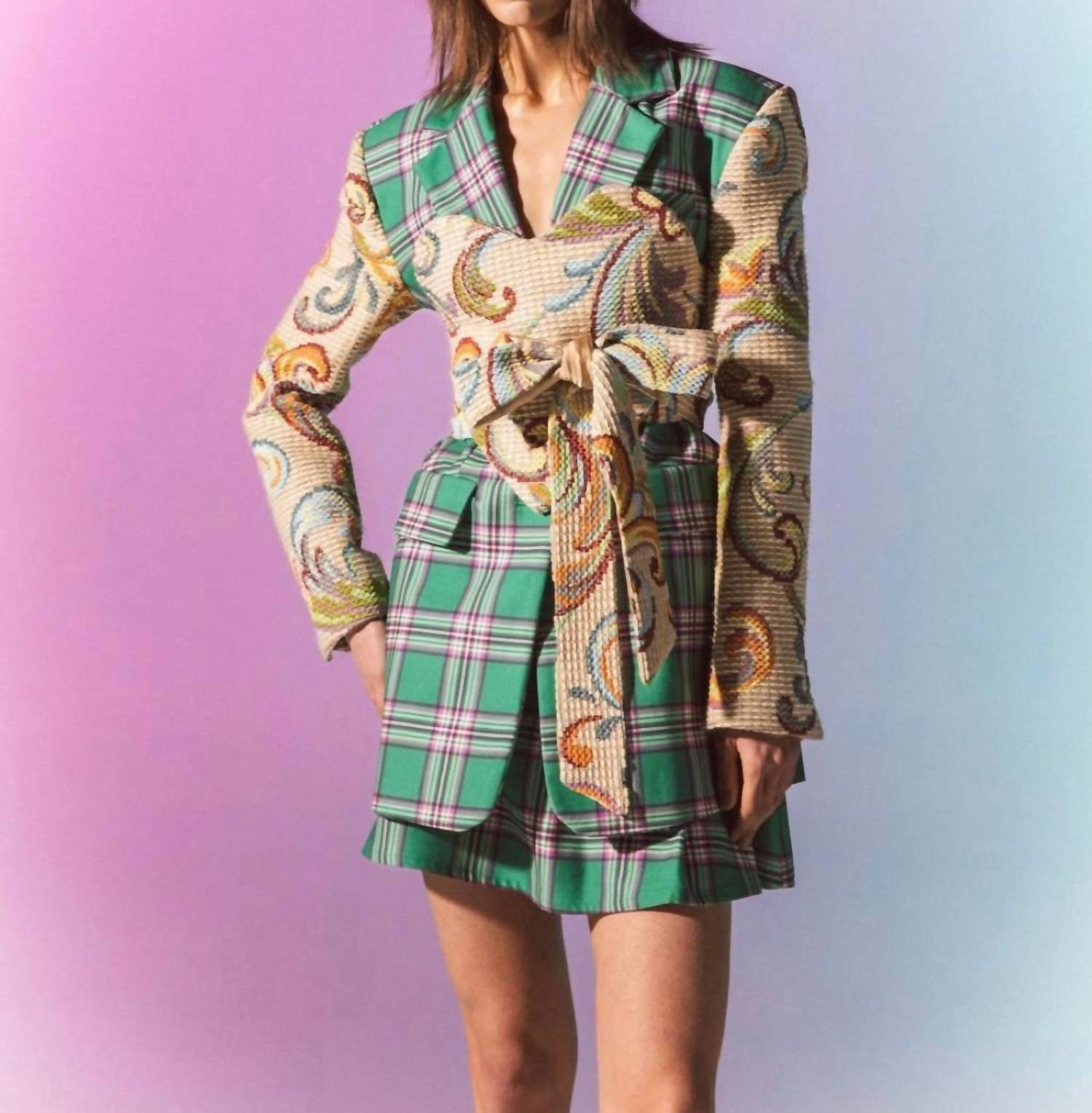 An elevated version of your favorite classic blazer. Introducing the Simona Bonacci Plaid Jacquard Jacket, a testament to refined Italian craftsmanship in a Green Fantasy color. This elegant women’s blazer features long sleeves and a front button closure, crafted from a luxurious wool blend with 85% cotton and 15% wool. The timeless plaid pattern paired with jacquard sleeves creates a sophisticated texture contrast, ideal for dinner parties or upscale events.