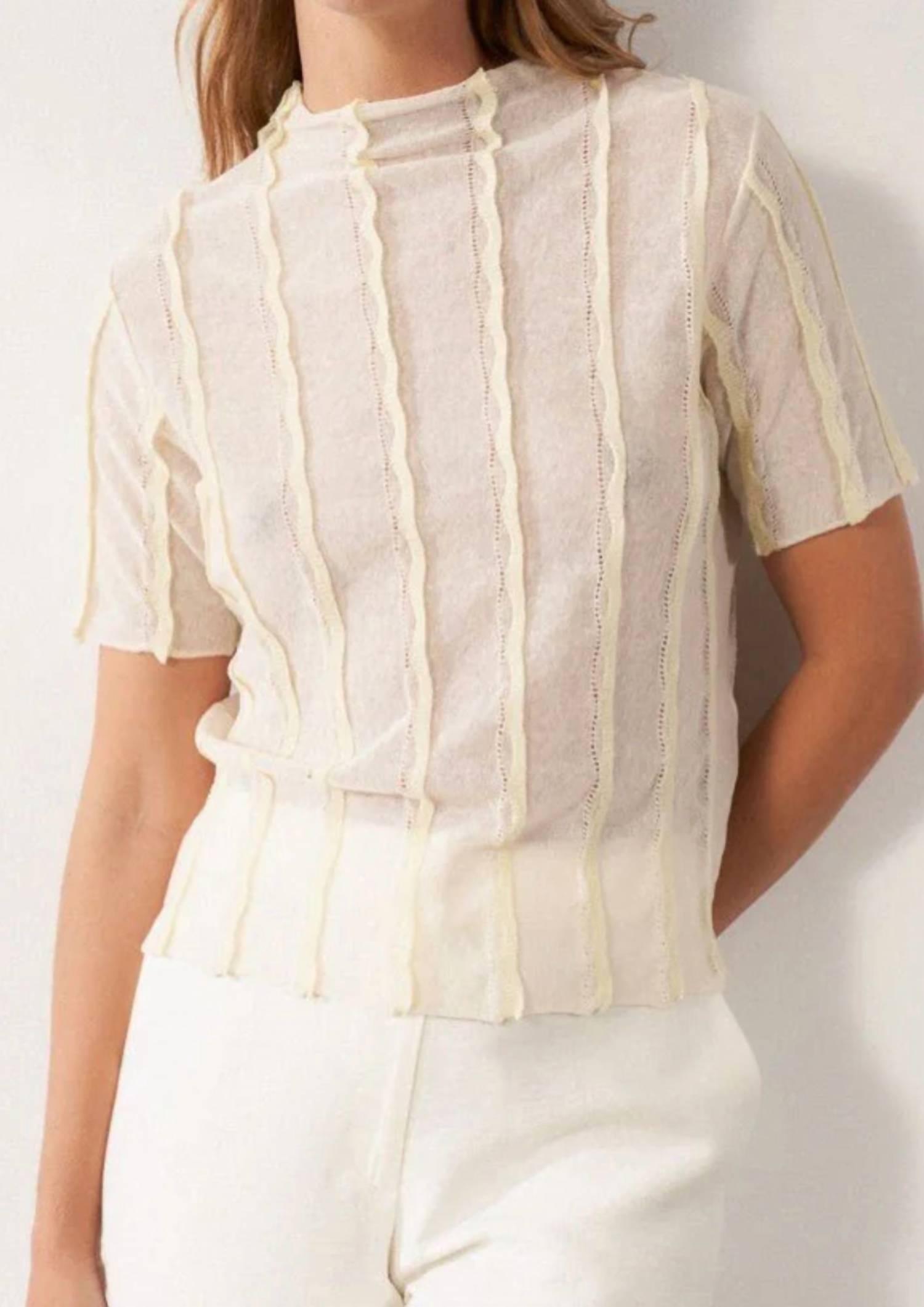 A timeless blouse that will never go out of style. Introducing the Sita Murt Short Sleeve Textured Sweater, an elegant minimalist piece in natural color perfect for summer. This chic sweater features a turtleneck and short sleeves with unique ruffle detailing for added texture. With a pull-on closure, it offers convenience and style in a patterned design. Care for this sophisticated addition to your wardrobe through machine wash.