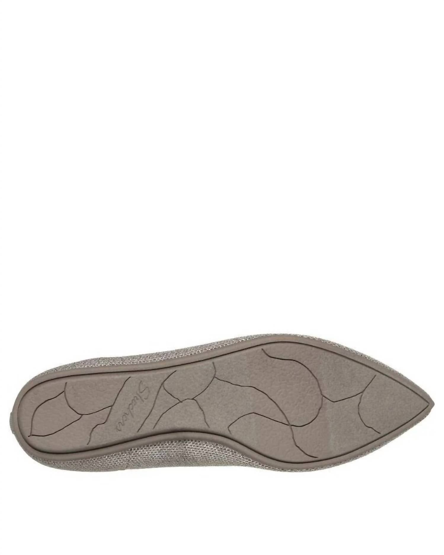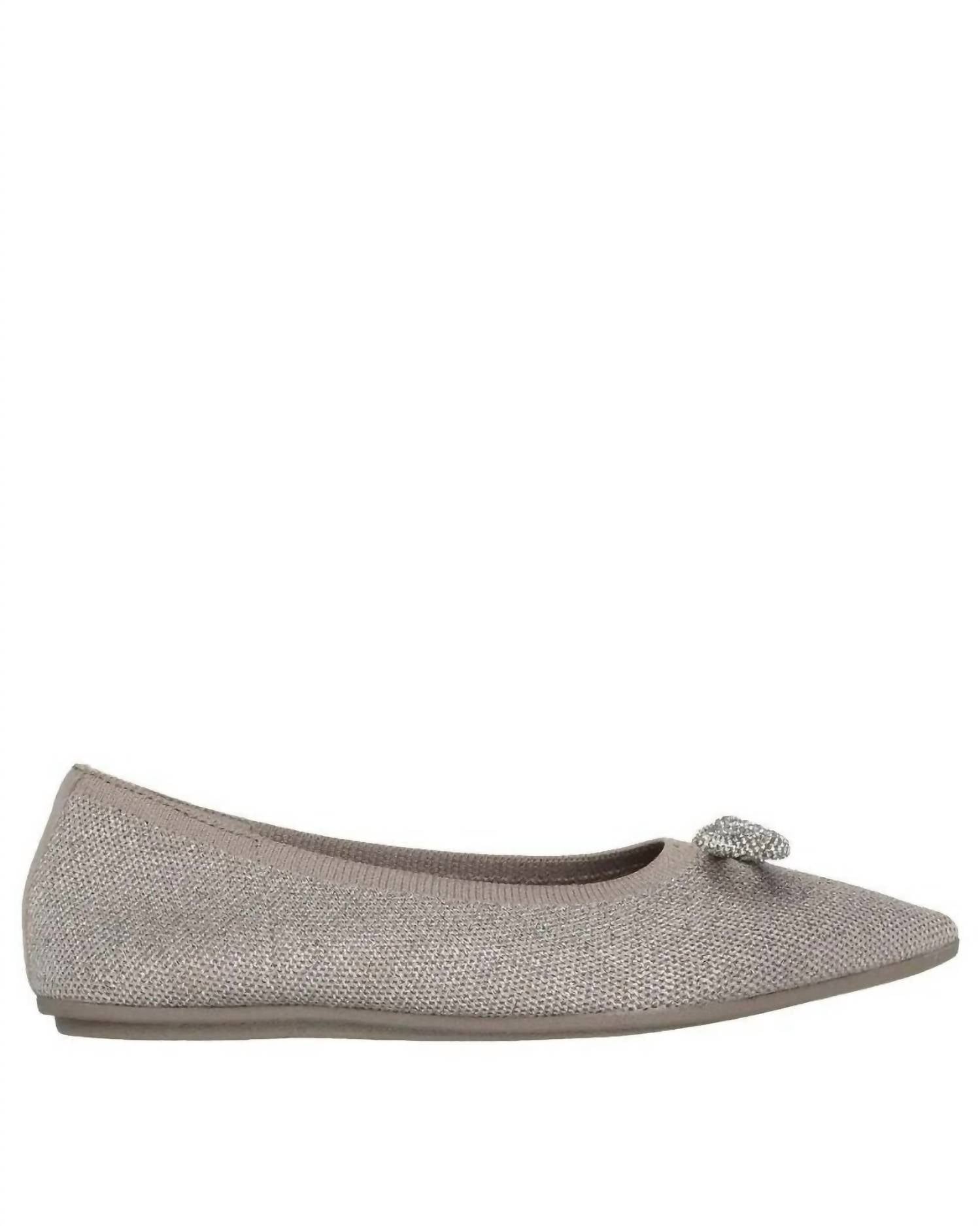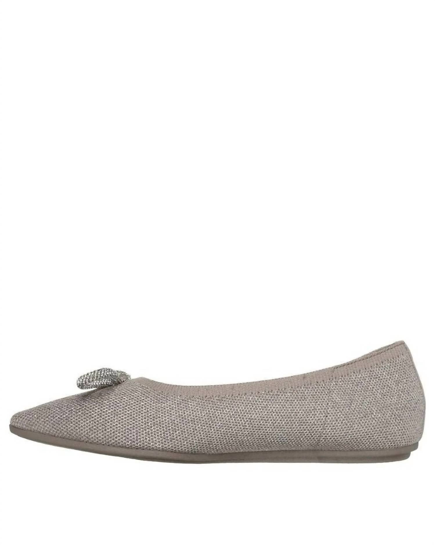 A preppy yet feminine take on the classic loafer. Step into sustainable style with the Skechers Women's Cleo Point Glitzy Haze Flats, a chic choice for the eco-conscious fashionista. This vegan skimmer in taupe features a sparkling metallic knit upper embellished with a bow, offering both elegance and planet-friendly benefits. The shoe is designed with a Stretch Fit® for ultimate sock-like comfort, and the cushioned Skechers Air-Cooled Memory Foam® insole ensures all-day ease. Thoughtful construction includes at least 40% recycled content in the upper and 20% recycled rubber in the flexible traction outsole.