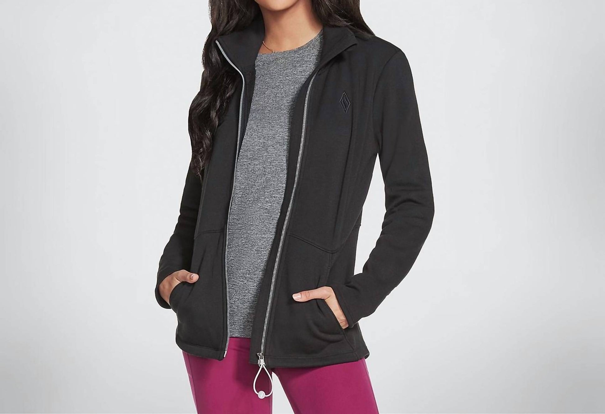 A jacket so versatile you can literally wear it with anything. Skechers presents the Women's Go Snuggle Soft Cozy Jacket, a perfect blend of style and comfort for winter athleisure wear. Featuring long sleeves and a collar neckline, this solid black casual jacket is designed with functionality and fashion in mind. The zip closure offers ease and practicality, while the presence of pockets adds utility for your fitness and workout needs. This activewear piece is crafted for women who value comfort without compromising on style.