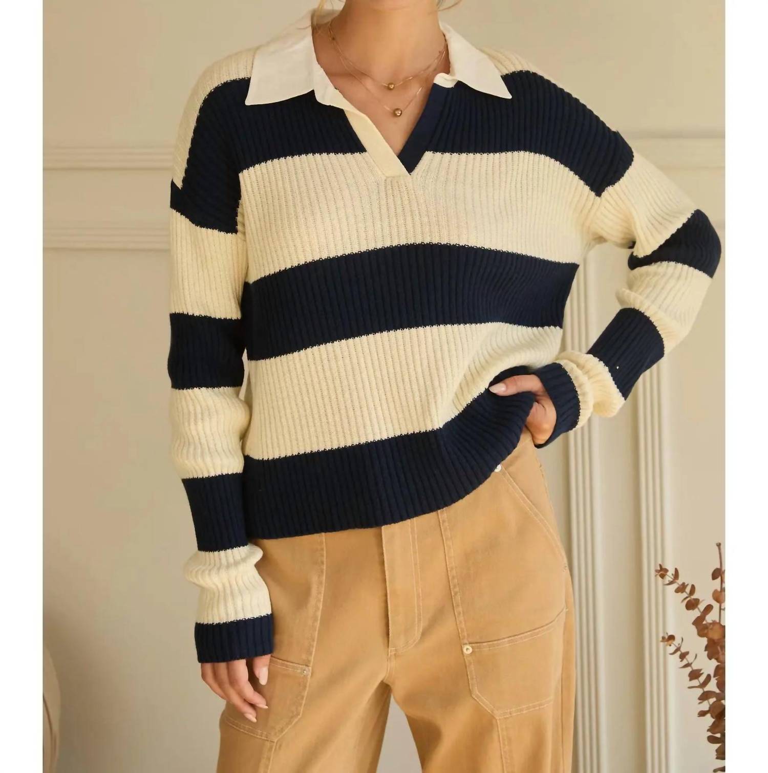 Stay warm and stylish in this versatile and effortlessly cool knitwear staple. Wear it alone or layered, it's the perfect sweater for the season and you'll wish you had it in every color. Introduce timeless style to your wardrobe with the Collared Stripe Sweater by SKIES ARE BLUE. This women's long sleeve knit sweater in navy and cream features classic stripes and a polished collar, offering sophistication for both office and casual settings. With a pull-on closure, this top encapsulates a minimalist trend perfect for spring and Thanksgiving occasions. Ideal for layering, it seamlessly enhances your ensemble without sacrificing comfort.