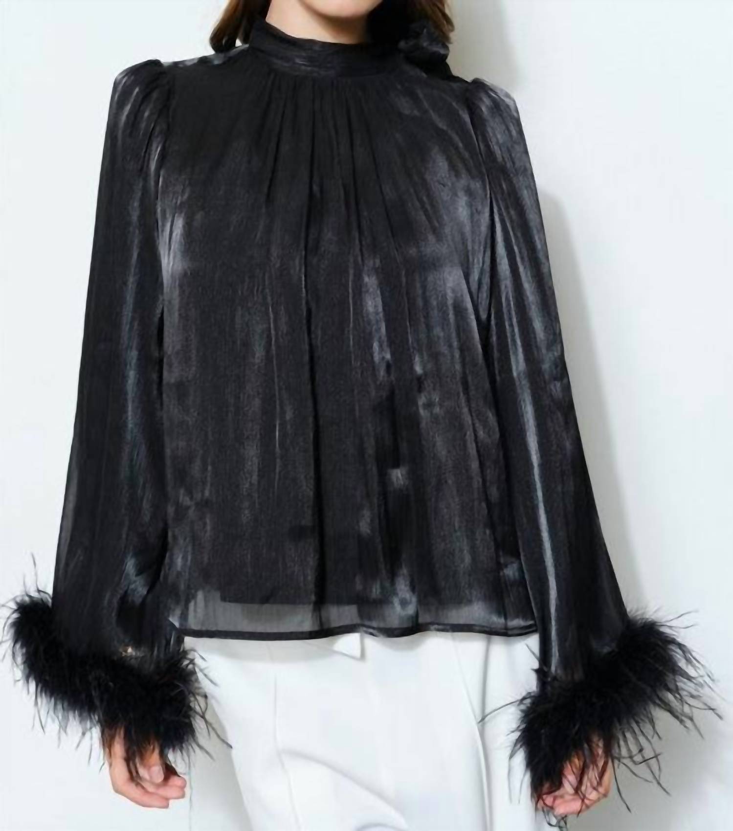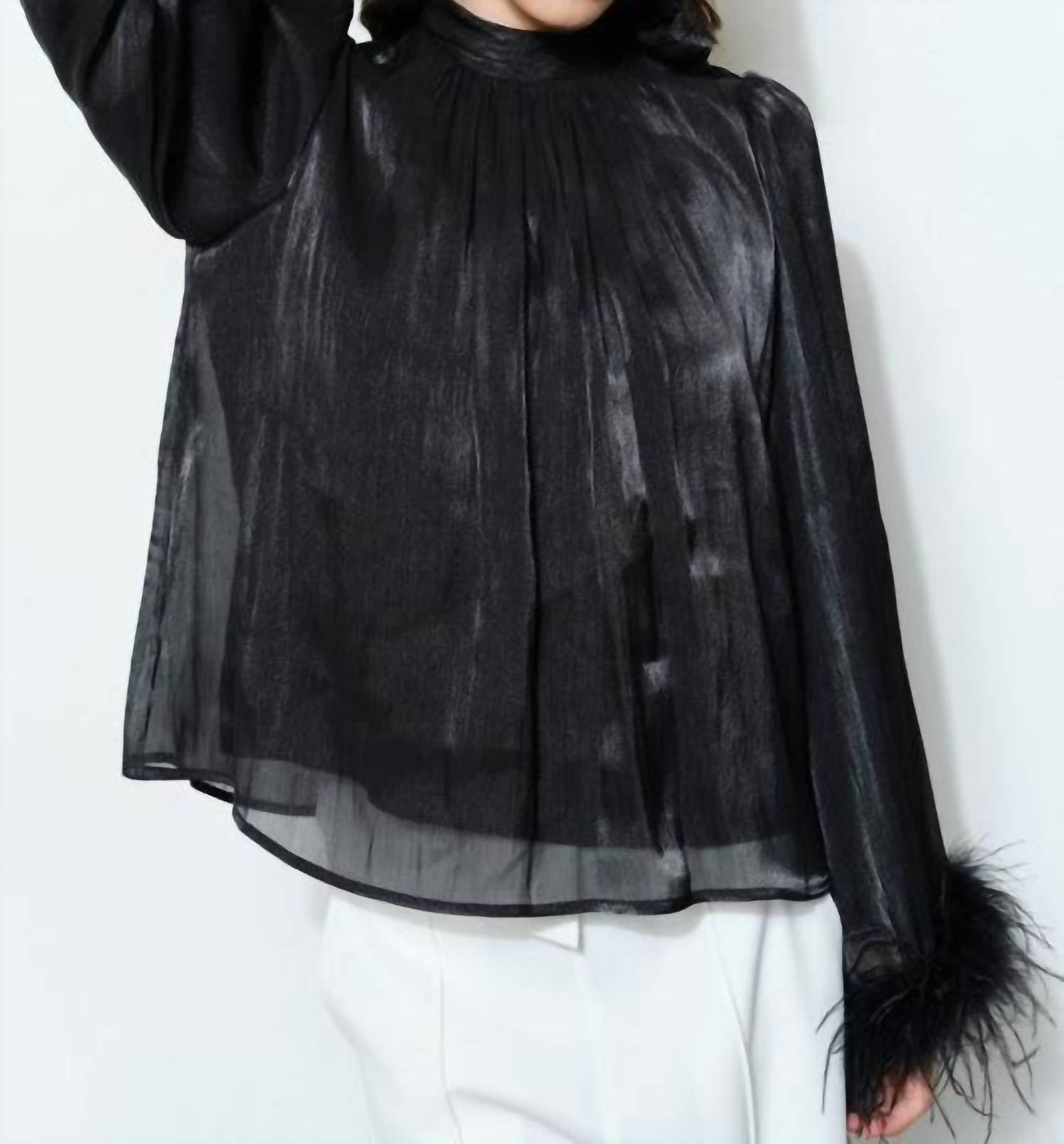 Skies Are Blue - Delphine Metallic Shimmer Bow Tie Feather Hem Blouse Top