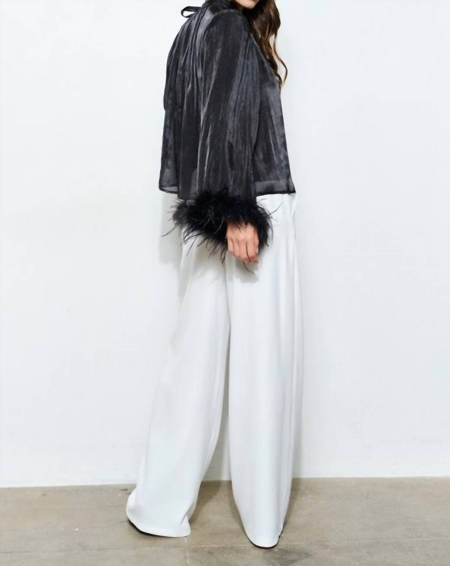 A timeless blouse that will never go out of style. Introducing the Delphine Metallic Shimmer Bow Tie Feather Hem Blouse by SKIES ARE BLUE, a statement piece perfect for evening occasions. This ivory blouse features long sleeves with subtle bell volume and an oversized bow tie detail at the mock neck. Made from 100% polyester with genuine feathers at the hem, the floaty silhouette drapes beautifully with its slightly A-line cut. Closure: Pull on. Ideal for dinner parties and spring season soirées.
