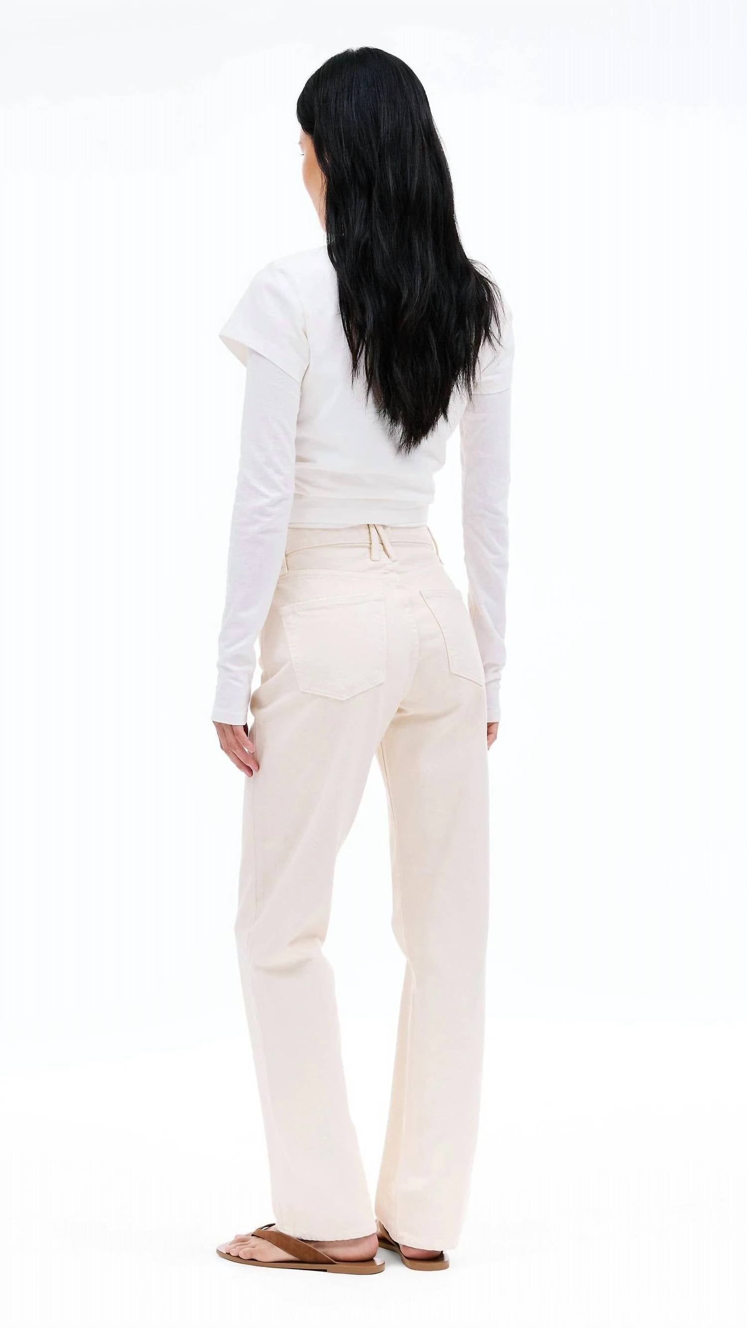 This classic straight leg jean has a perfect fit and goes with just about everything. Elevate your style with the London High Rise Straight Jean by SLVRLAKE in sophisticated ecru, a staple for the minimalist wardrobe. These straight-leg jeans are crafted from 100% cotton for a relaxed fit, featuring a high-rise with a 11" rise and 30.75" inseam. Designed with a brushed antique button and zip closure, these jeans run one size small, so sizing up is recommended. Care for these jeans is simple with machine wash cold and lay flat to dry instructions. Modeled in size 26 (5' 7 1/2" height, 34" bust, 26" waist, 37" hips).