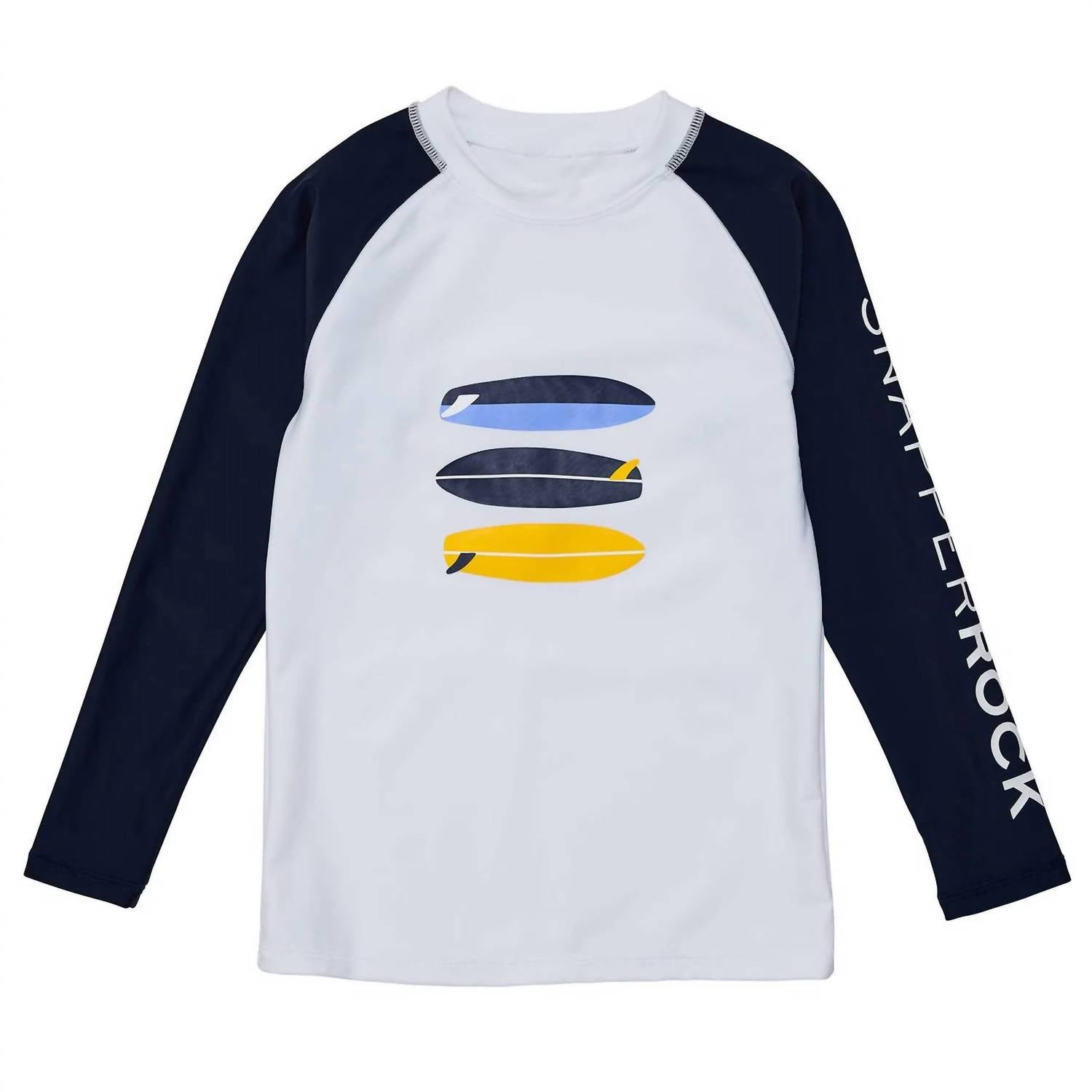 Introducing the Boys Wave Break Long Sleeve Rash Top by Snapper Rock, a sun-smart beach essential. This versatile piece features long sleeves and a striking combination of a crisp white body with a vintage surfboard print and contrasting navy sleeves. It boasts a 50+ UPF rating, blocking 98% of harmful UVA & UVB rays, and is quick-drying, lightweight, and breathable. Care: Machine wash and lay flat to dry. Perfect for boys ready to ride the waves this summer.
