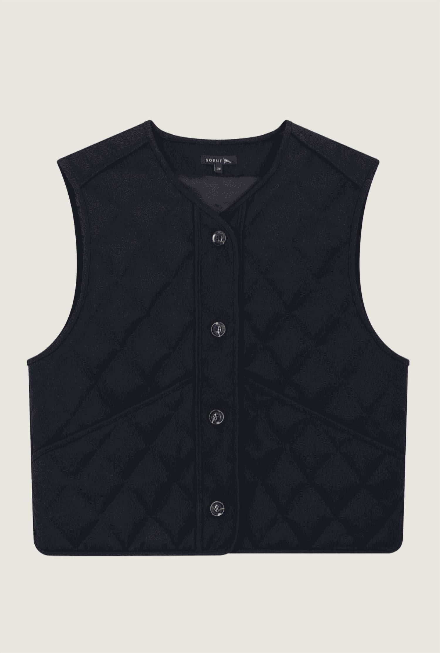 Throw this vest over an all black outfit for a perfectly polished look. Introducing the Ulla Quilted Vest by Soeur, a stylish companion for fall in a classic navy monochrome. This women's straight-cut vest features a sleeveless design, crafted from 100% cotton with a sophisticated V-neckline. Its button closure adds a refined touch, making it perfect for engagement occasions and Thanksgiving gatherings. For care, simply machine wash as needed.