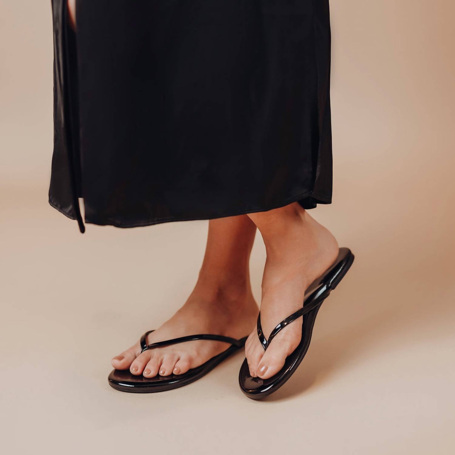 This sandal will take you from brunch to dinner and everything in between. Step into summer with the Solei Sea Women's Indie Flip Flop Sandal in sleek Onyx Patent, an elegant choice for holiday parties and effortless minimalist style. Crafted with a vegan leather upper and a recycled outsole, these sandals offer a sustainable take on a classic design. The slim sole and straps provide a chic look, while the cushioned arch support and footbed ensure all-day comfort. For half-size wearers, sizing up is recommended, and cleaning is a breeze—simply use mild soap and water, as they're water-resistant and perfect for any summer adventure.