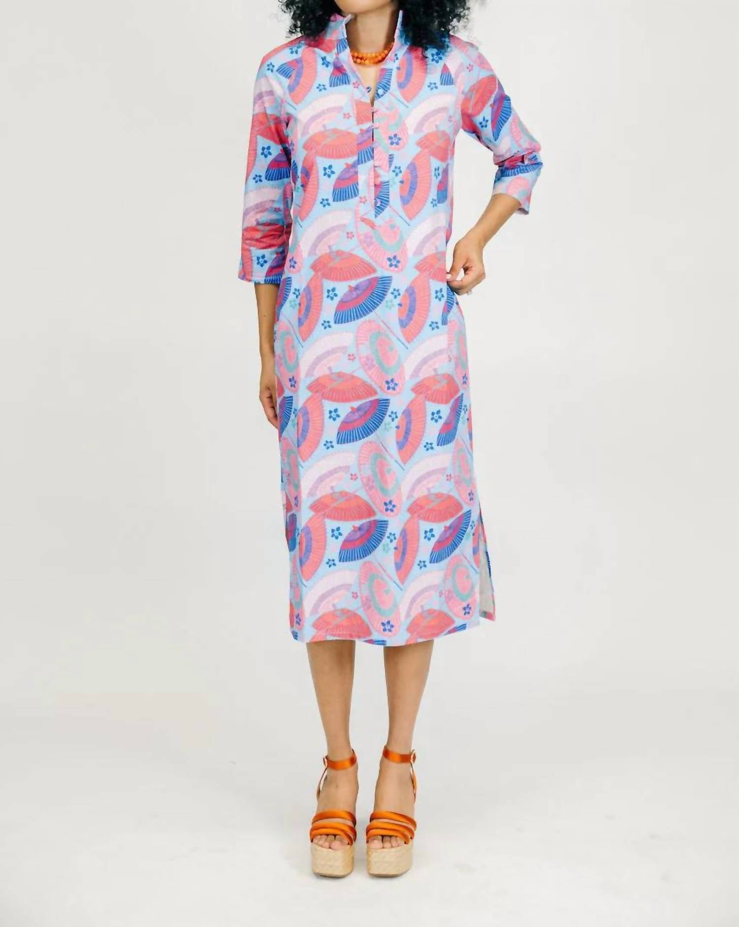Just add slides or mules and you are good to go. Introducing the Solelia Kimmi Kimono Dress, a statement piece combining elegance with a vibrant parasol print in hues of blue, pink, and violet. Crafted from a luxurious cotton and silk blend, this dress features three-quarter sleeves, a stand-up collar, and delicate fabric-covered buttons with loop closures, measuring approximately 46 inches in length. Its shirt silhouette and exclusive hand-painted design make it ideal for a spring dinner party. Embrace maximalist trends with a touch of luxury in this midi-length stunner.