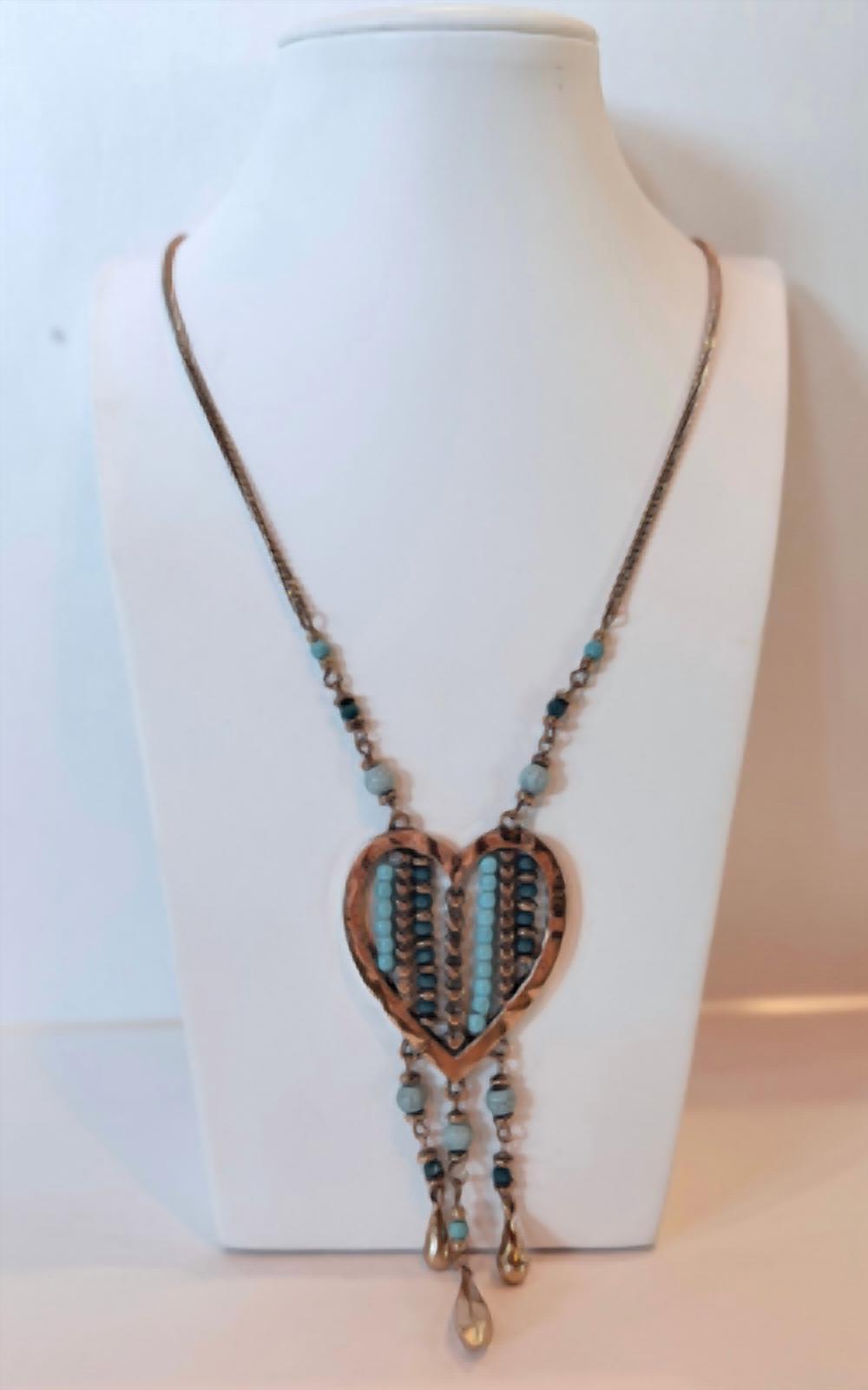 The perfect stand-out necklace that complements even the most basic t-shirt. Beaded heart necklace with beaded tassles and adjustable clasp.
