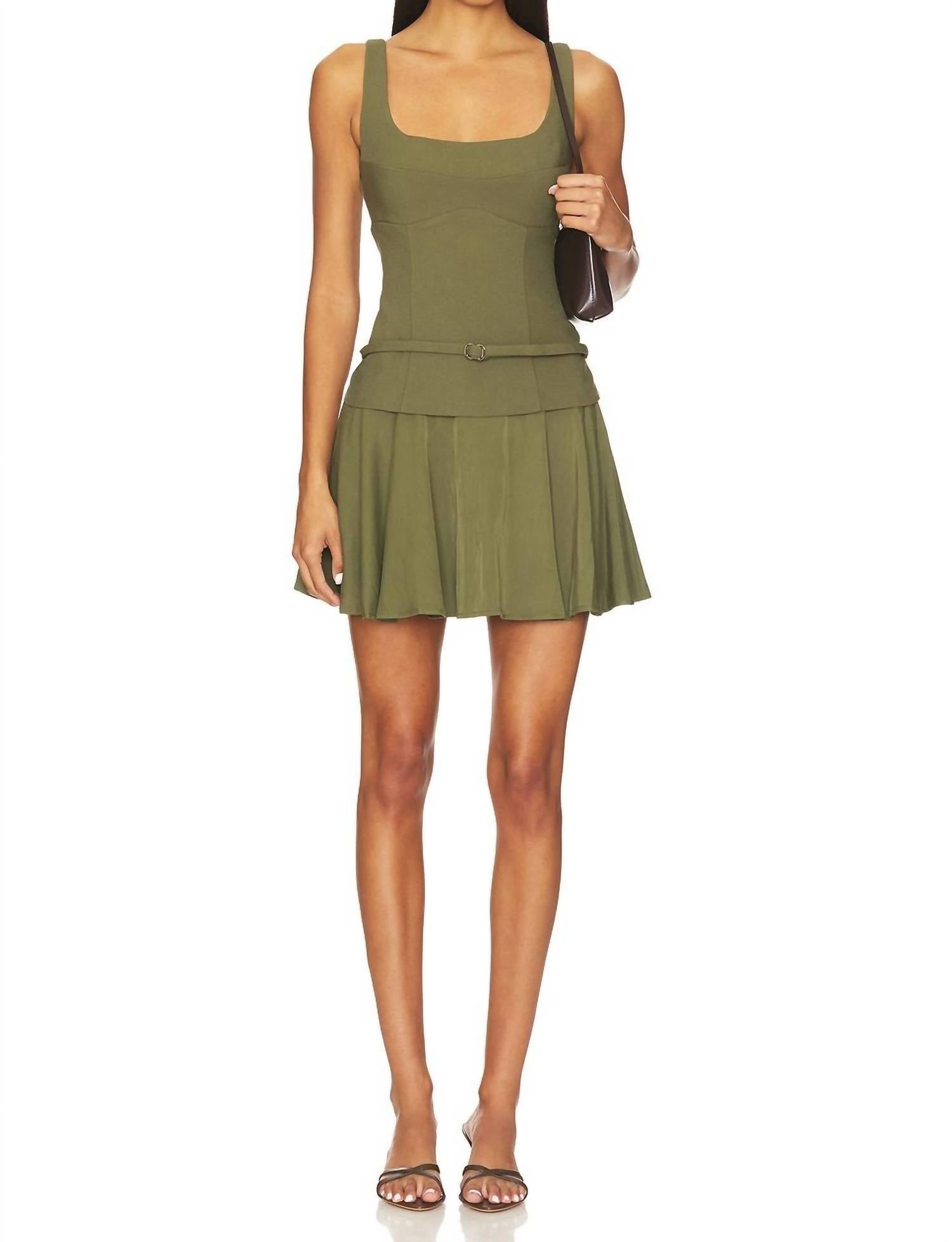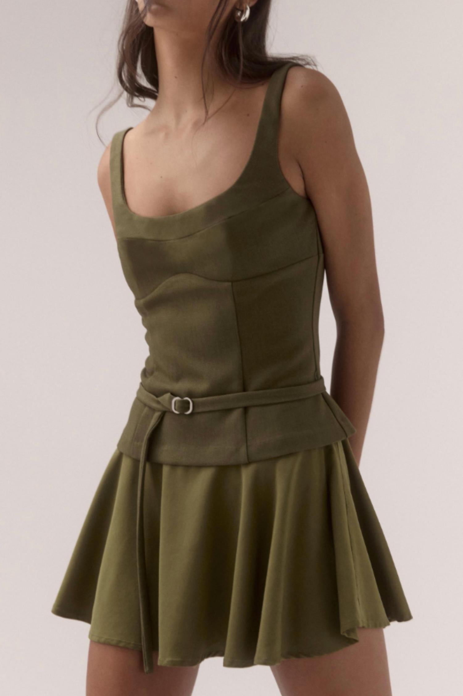 The kind of easy and flattering dress you'll be reaching for all season long. The Demi Mini Dress by SOVERE combines elegance and versatility with its flattering pleated skirt and detachable belt featuring a silver-tone buckle. This sleeveless fit and flare dress, in a chic olive hue, is composed of a blend of Polyester, Viscose, Elastane, with a Rayon, Nylon, and Polyester lining for comfort. Designed for summer engagements or minimalist gatherings, it includes a hidden back zip closure for a seamless silhouette. Care is simple: machine wash cold and hang to dry for a pristine finish.