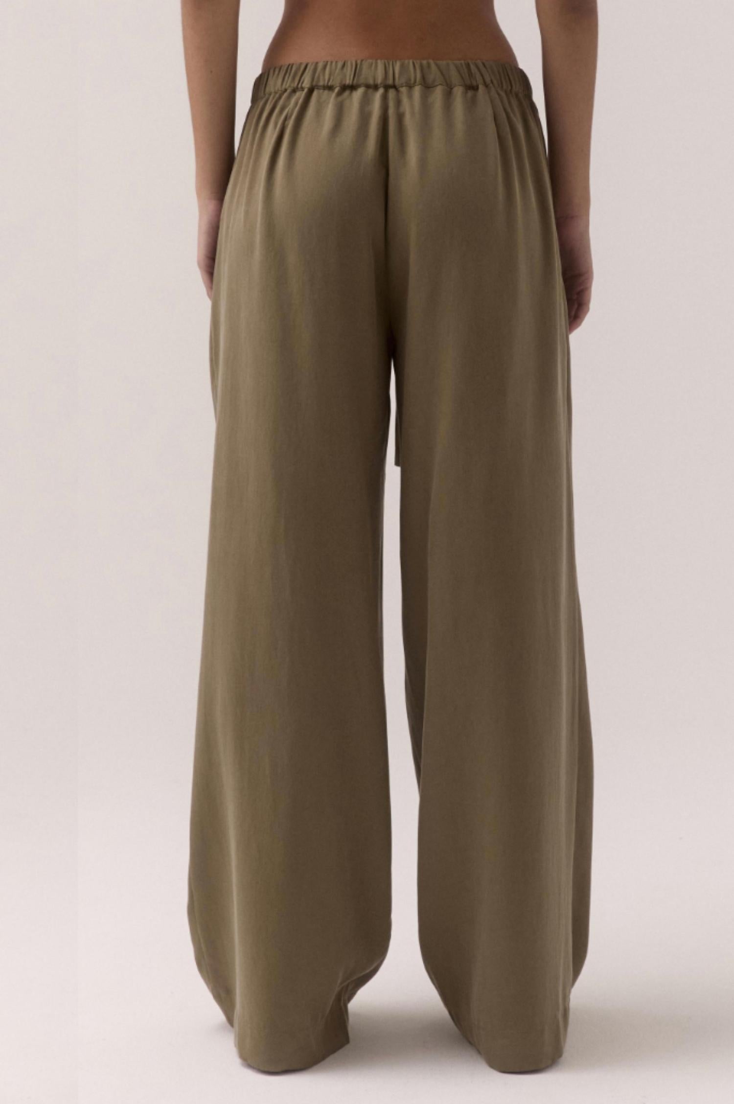 Elevate your wardrobe with the Espy Wide Leg Pants by SOVERE, crafted in a solid olive that exudes relaxed sophistication. Made from 100% Lyocell, these mid-rise pants feature a wide leg shape and an elasticated waistband with a fabric belt secured by a silver metal slider. Practical side seam pockets add functionality, while the fly front boasts a hook and eye closure for a seamless finish. Easy to care for, simply machine wash cold and line dry for effortless maintenance.