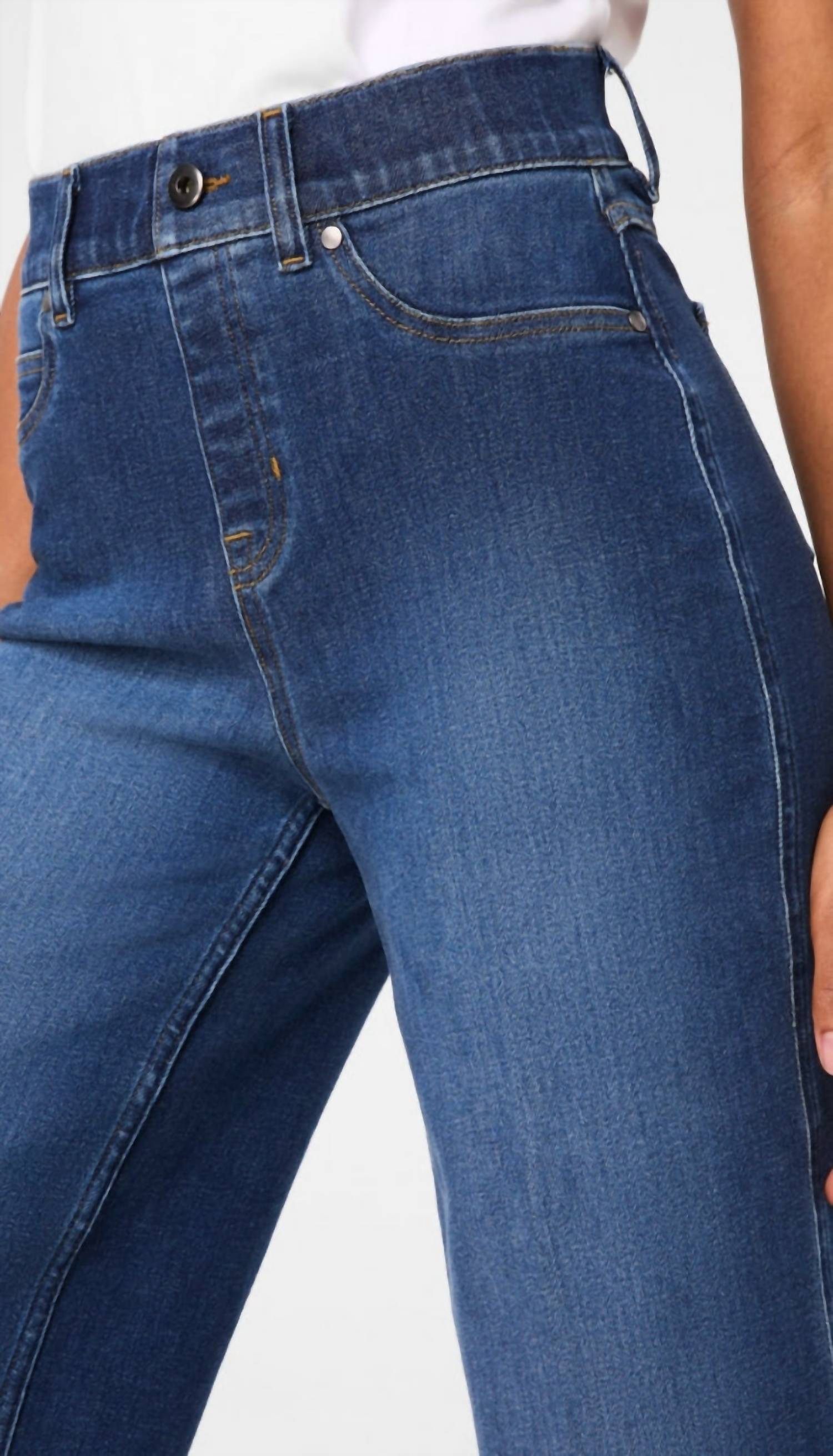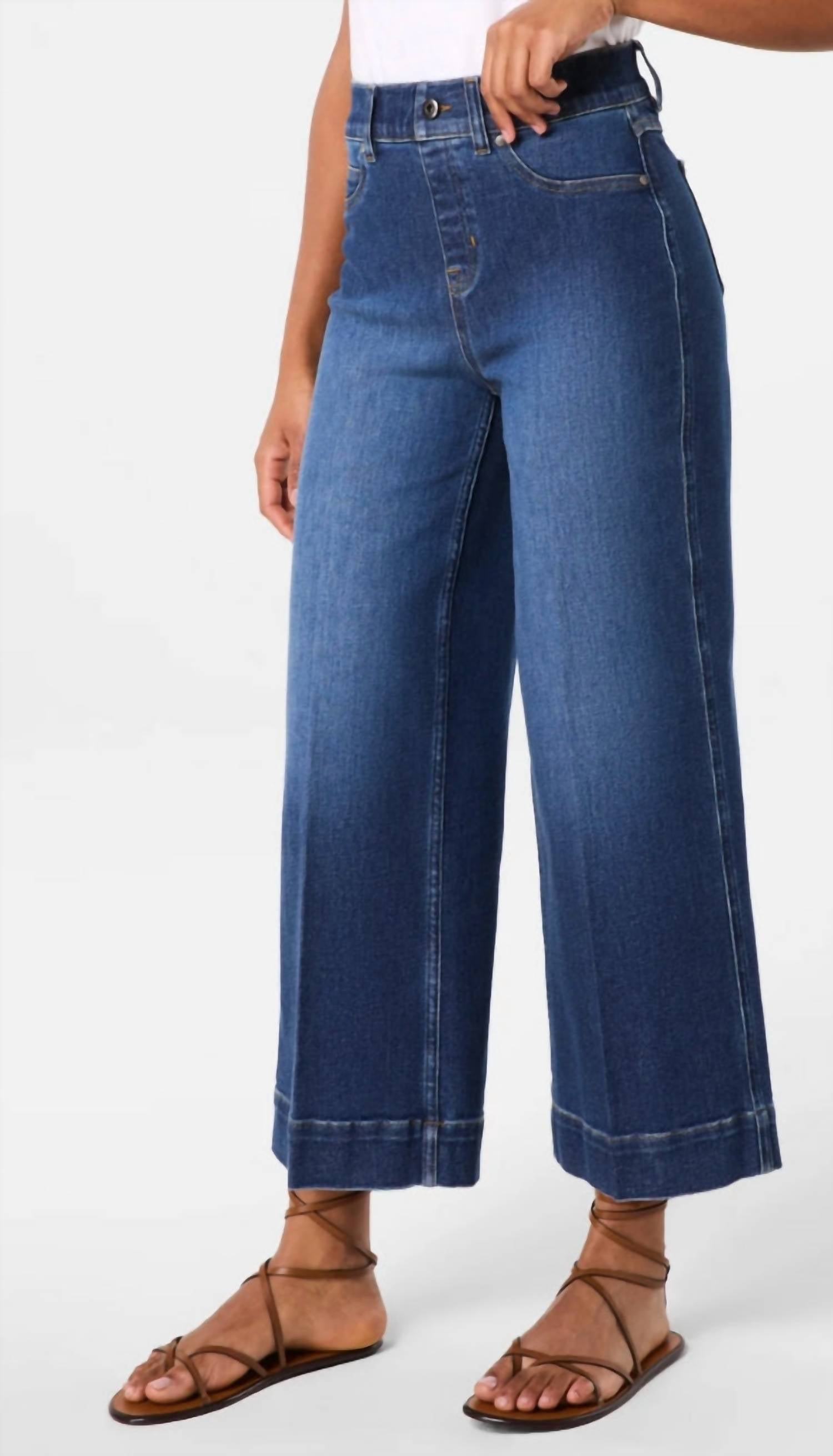 A flattering silhouette that's suprisingly versatile. Experience unparalleled comfort with the Spanx Everywhere Cropped Wide Leg Jeans in Authentic Blue, perfect for your spring wardrobe. These high-rise jeans feature a flexible cotton blend material, offering medium compression with built-in TummyTamer Tech™ for a flattering silhouette. Designed with a cropped wide leg and regular fit, they have a 12" wide leg opening and inseams of Petite 24.5", Regular 26.5", and Tall 29.5", ideal for various heights. Enjoy the pull-on closure with a faux button front for a sleek look, complete with functional back pockets, and keep them looking fresh by machine washing and tumble drying low.