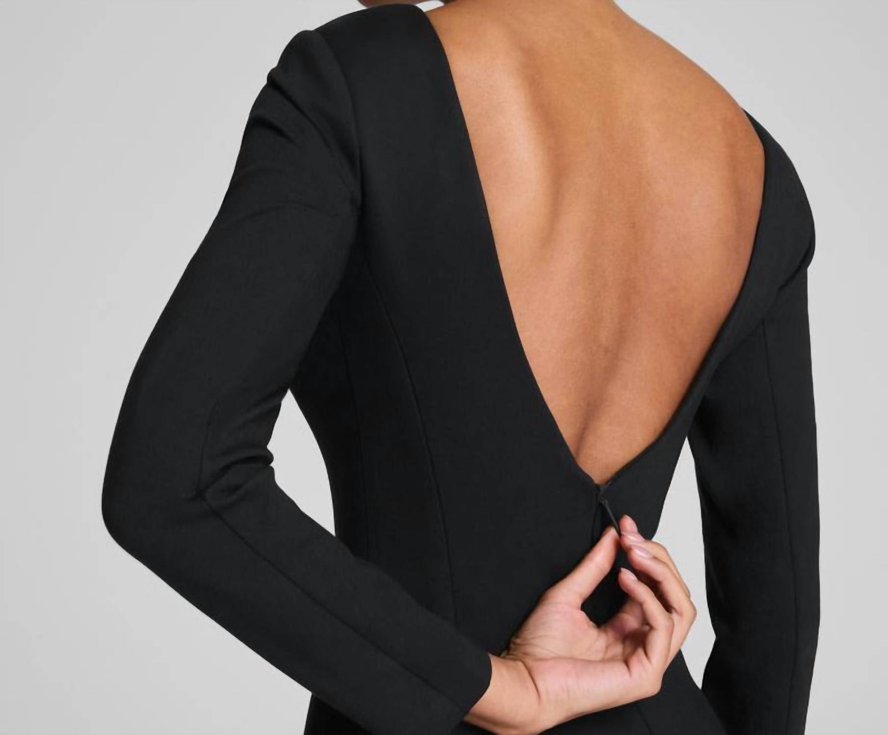 Cute and comfortable, this long sleeve dress has it all. Presenting the Spanx Ponte Low-back Midi Dress, a chic evening essential in classic black. With a 44-inch length, this sheath dress showcases a long sleeve design and a crewneck, crafted from a luxurious 68% Ecovero™ Viscose, 28% Nylon, 4% Elastane blend. The zip closure and solid pattern enhance its sleek silhouette, capped with a low back for a touch of drama. Care for this elegant piece through machine washing and line drying, making it a reliable addition to your fall wardrobe.