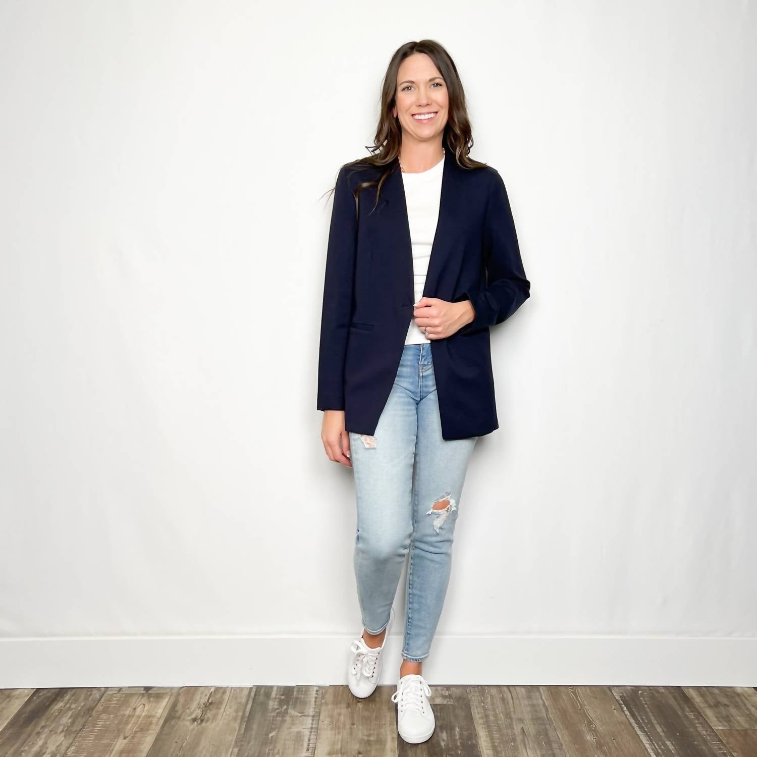 Tailored to perfection, this blazer will be your go-to jacket for years to come. Elevate your wardrobe with The Perfect Blazer by Spanx in Classic Navy, expertly crafted for timeless elegance. Featuring long sleeves and a classic collar, this women's blazer is made from smoothing premium ponte fabric with a 4-way stretch, composed of 68% Rayon, 28% Nylon, and 4% Elastane. Designed for a polished look, it includes functional pockets, ensuring convenience and style for any cocktail party this fall. Care: Machine wash cold, inside out, line dry, low iron if needed.