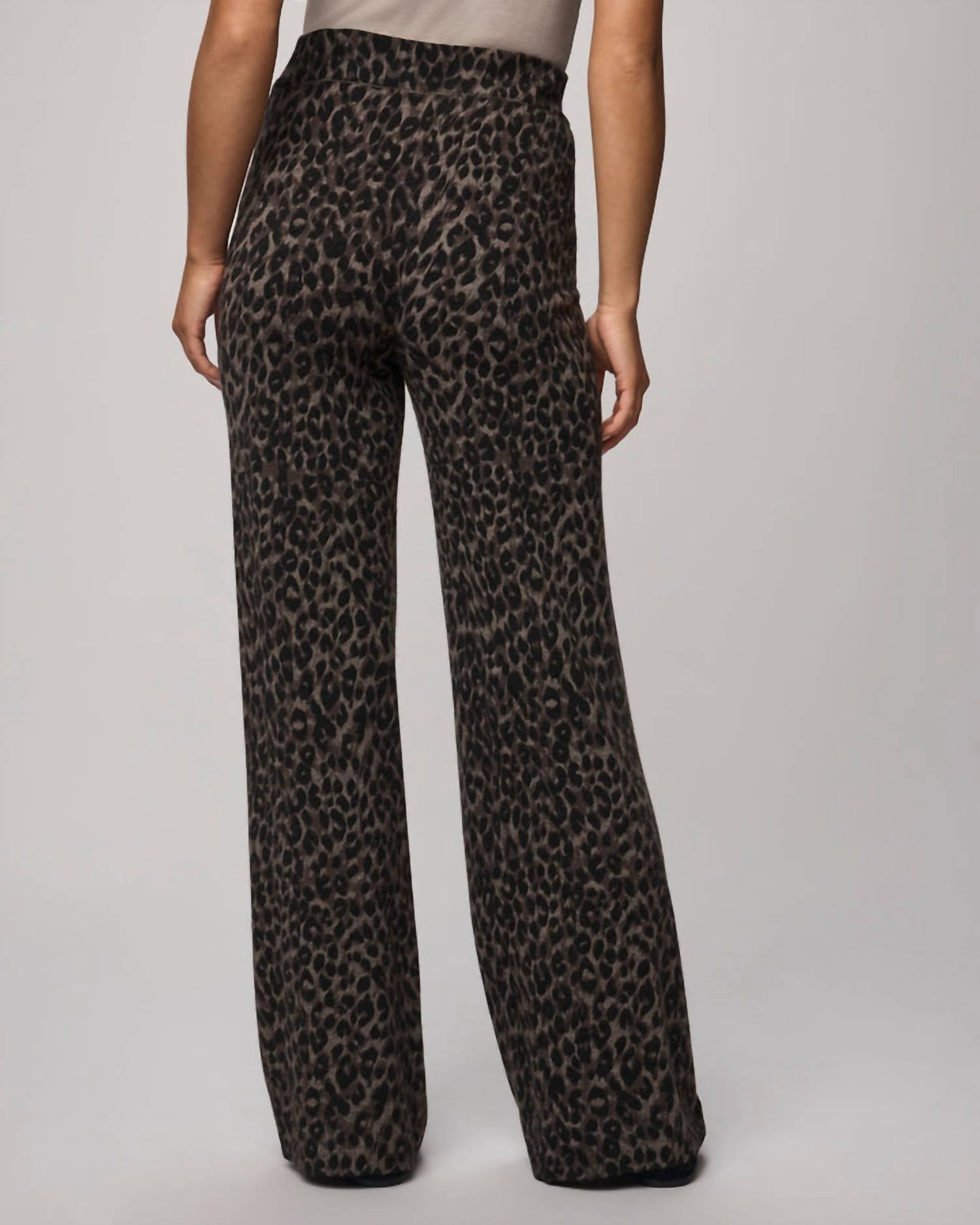 Introducing the Leopard Sweater Pant by Splendid, a must-have for fashion-forward lounging with its bold animal pattern. Designed in a wide-leg silhouette and featuring a regular fit, these pants offer a comfortable elastic waist for easy wear. Made from a luxurious acrylic blend with a touch of cashmere, they promise a soft feel perfect for relaxing. Closure: Pull-on style. Care: Dry clean only. Inseam: 28.75 inches.