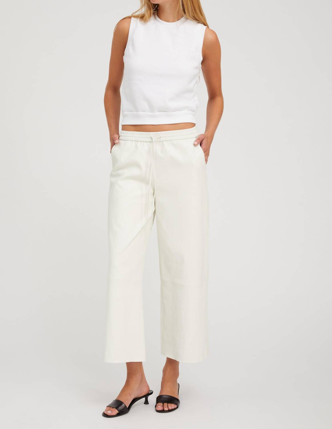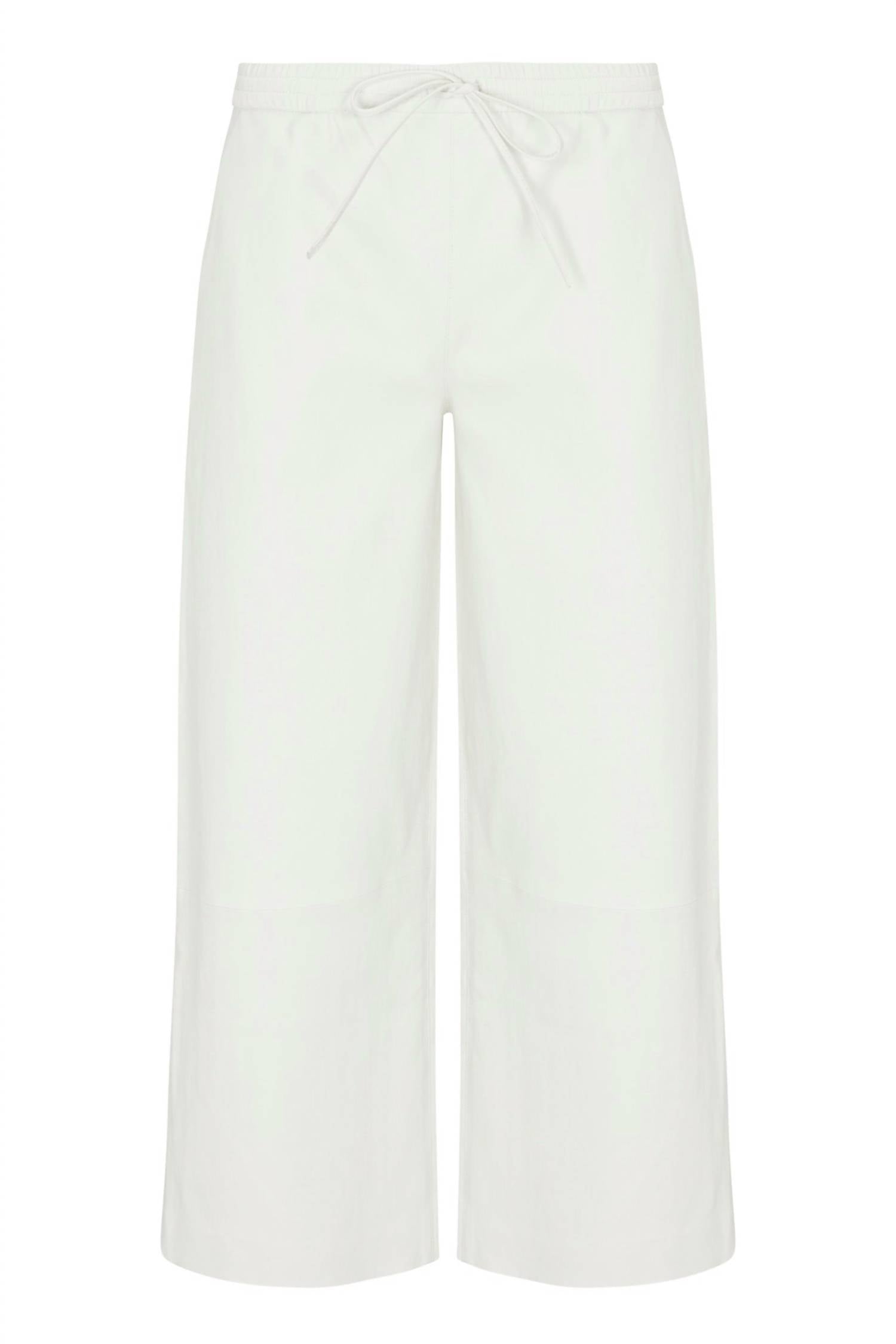 Experience chic comfort with the Cropped Baggy Pants by SPRWMN, featuring a high-rise, wide-leg silhouette in solid white for a minimalist look. Designed with the brand's signature French stretch-leather, these relaxed fit pants offer a second-skin feel that's breathably perfect for year-round wear. With a pull-on closure and adjustable drawstring waist, they provide versatile styling to suit your comfort preference. Enjoy a contemporary edge with an inseam of 26 inches and a rise of 11 inches, ideal for holiday parties or any occasion. Model is 5'10" and wears size S.
