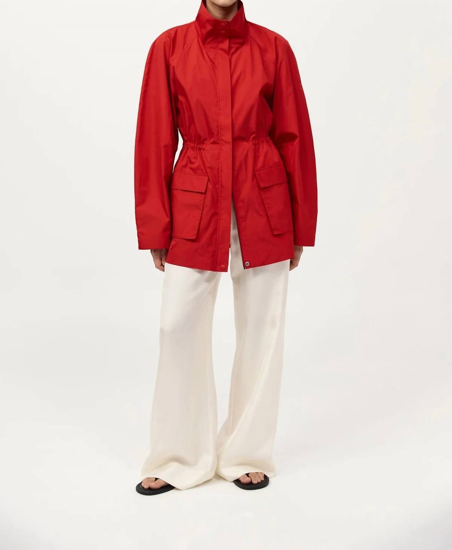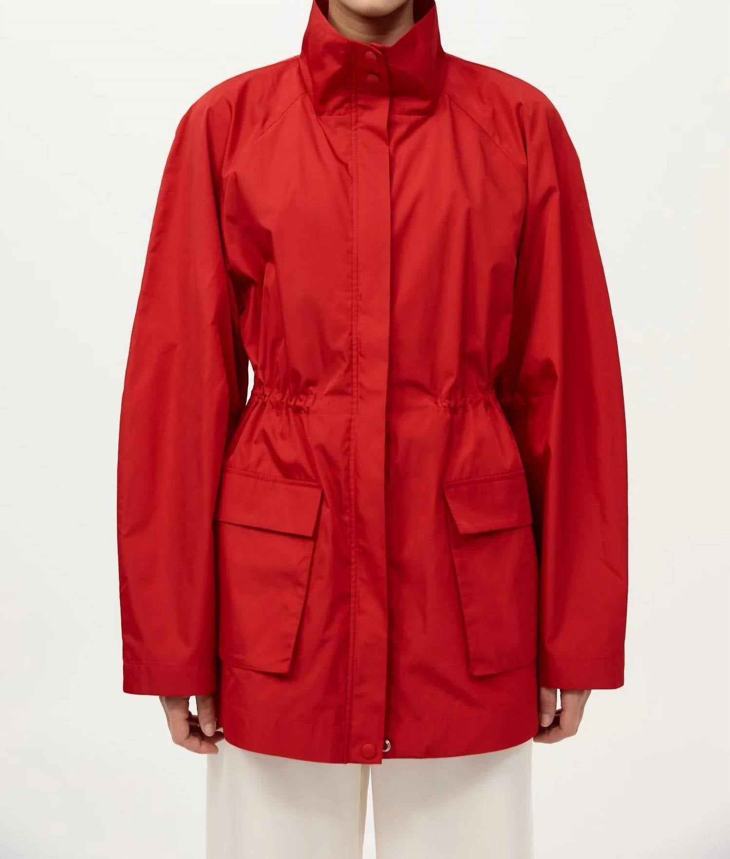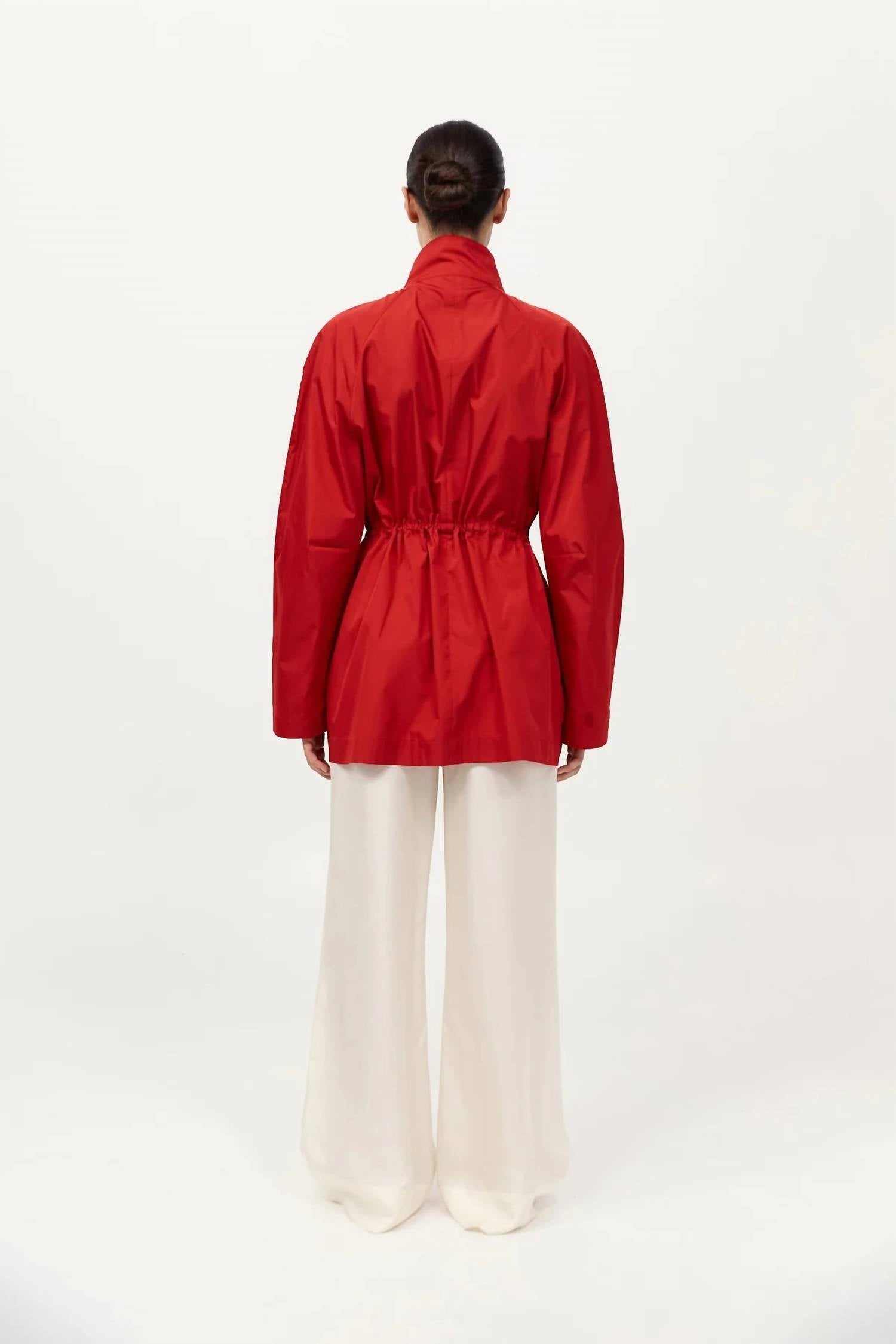 Make any outfit instantly cool by pairing it with this bomber jacket. Experience the seamless blend of function and minimalist design with St. Agni's Paper Taffeta Parka Jacket. This monochrome bomber-style jacket comes in a vibrant red, featuring long raglan sleeves and a stand collar for a sleek look. It is composed of 80% recycled polyester and 20% silk, crafted with an adjustable internal drawcord waist perfect for layering during transitional climates. Closure is made easy with its center-front zip, and practical care includes machine wash and tumble dry.