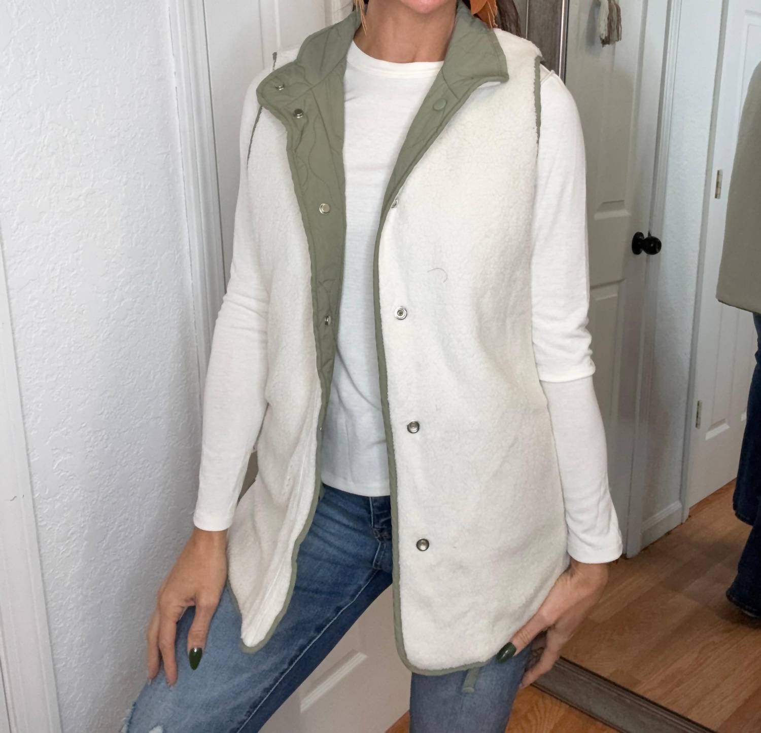 Throw this vest over an all black outfit for a perfectly polished look. Elevate your wardrobe with the Remy Reversible Quilted Vest in Olive by Staccato, a chic addition for winter travel and beyond. This sleeveless vest is crafted from 100% nylon with a soft polyester sherpa inner, providing two versatile looks with olive green quilting and ivory sherpa. Featuring a practical snap closure, front patch pockets, and a customizable drawstring waist, this minimalist piece offers both style and function. Perfect for your winter holidays, the vest comes in a true-to-size relaxed fit, making it an ideal layering option for changing weather conditions.