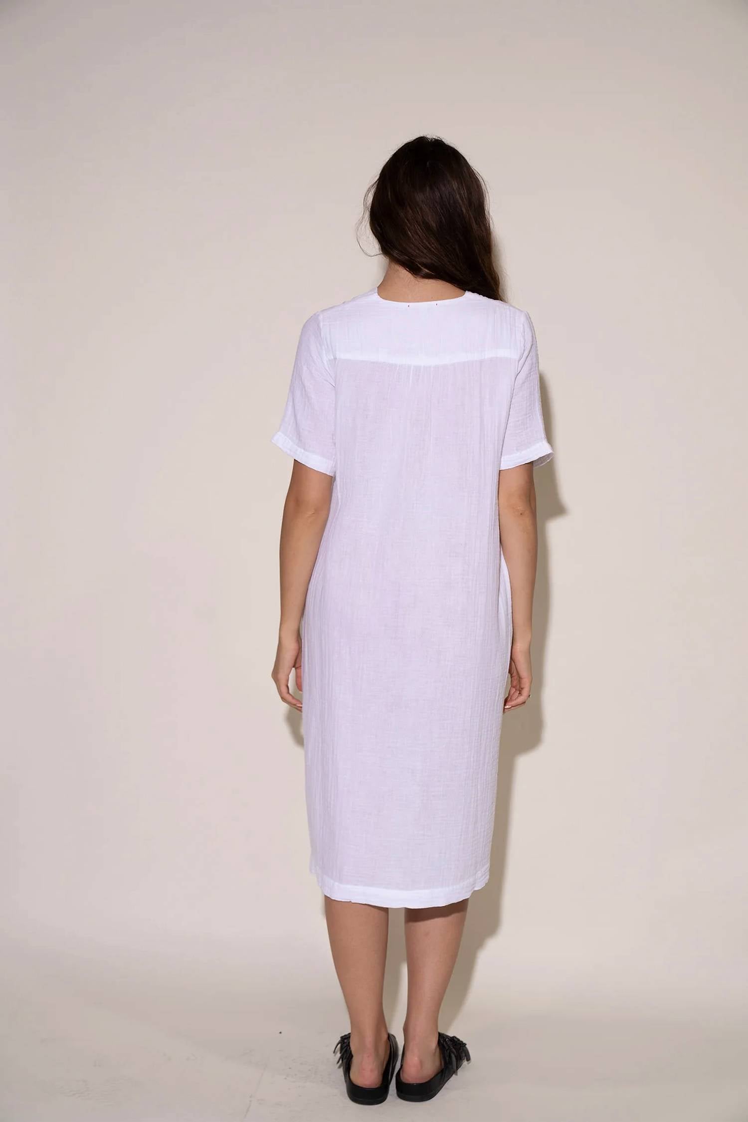 The perfect length dress does exist. Introducing the Gauze Nicola Dress by STARKx, a perfect minimalist piece for your summer wardrobe. This shirt silhouette features short sleeves, a V-neck, and comes in midi length, crafted from 100% cotton gauze for a breezy feel. Designed with front pockets and a clean neck finish, this solid white dress makes an ideal cover-up for beach or island vacations. Country of origin is unspecified. Closure: Pull on. Care instructions include machine wash and tumble dry, ensuring easy maintenance.