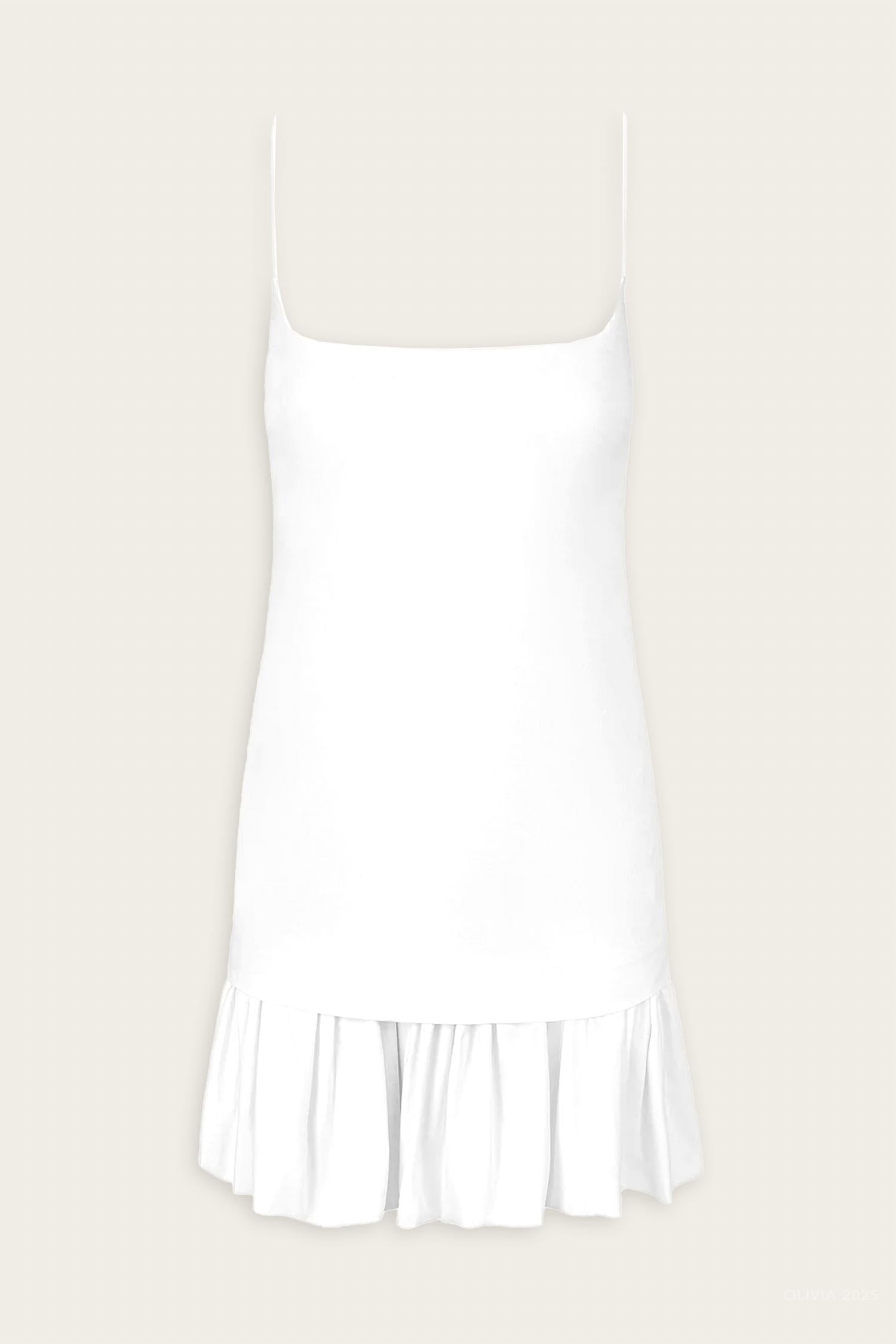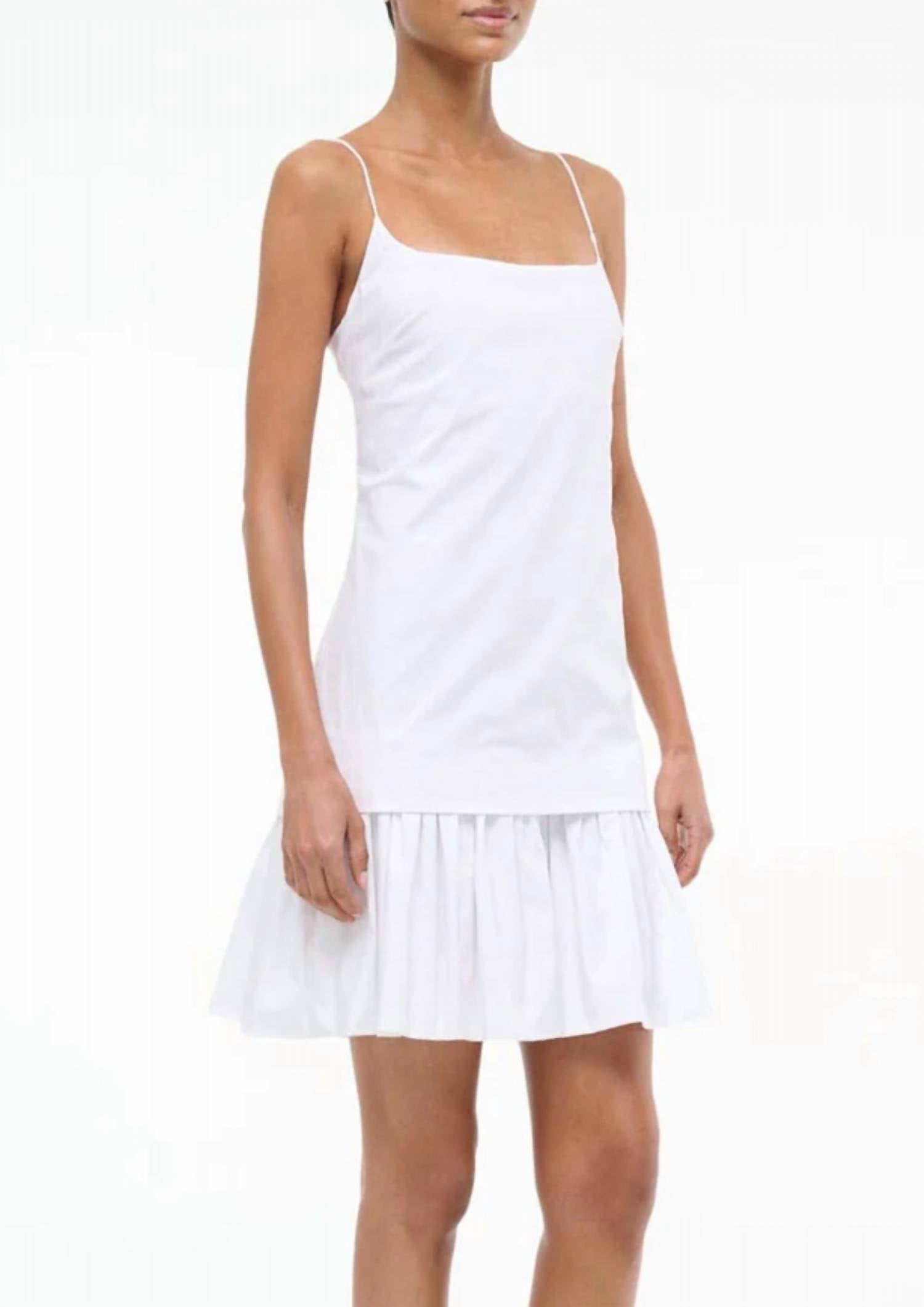 The perfect mini dress for those warmer months. Meet the Ari Mini Dress by STAUD, a timeless piece in solid white designed for summer sophistication. With its spaghetti straps and an A-line silhouette, it offers a chic look for special occasions like anniversaries or Valentine's Day. Crafted from 98% cotton and 2% spandex, with a 100% cotton lining, this dress is imported and boasts a convenient zip closure. To maintain its elegance, hand wash is recommended.
