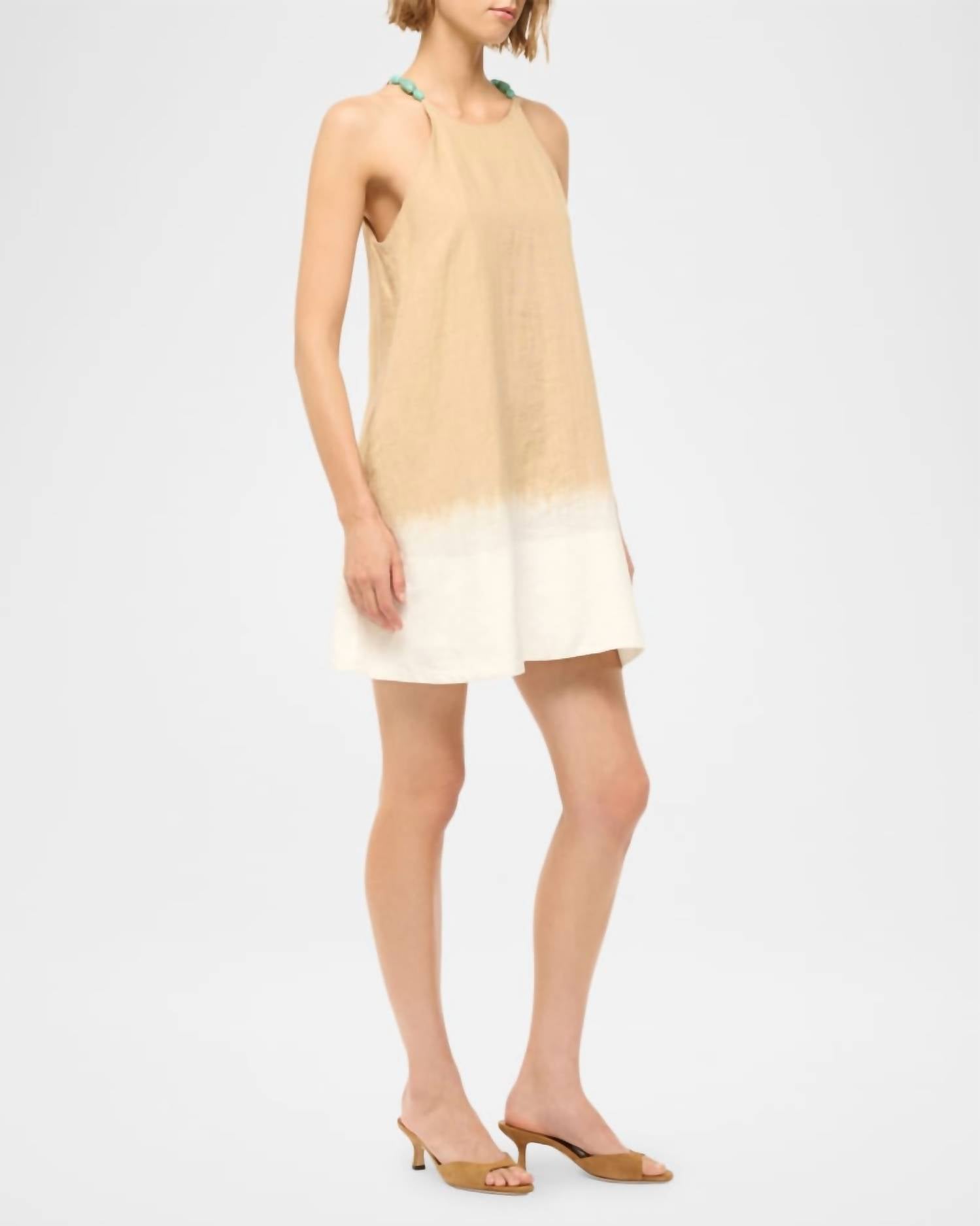 The kind of easy and flattering dress you'll be reaching for all season long. This mini-length dress features a flattering A-line silhouette, accented with beaded halter straps and a button closure at the back neck. A dip-dyed hem adds a playful touch, while its 100% linen construction keeps it light and breathable.
