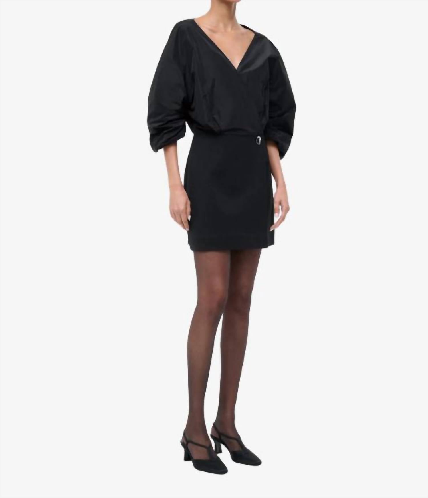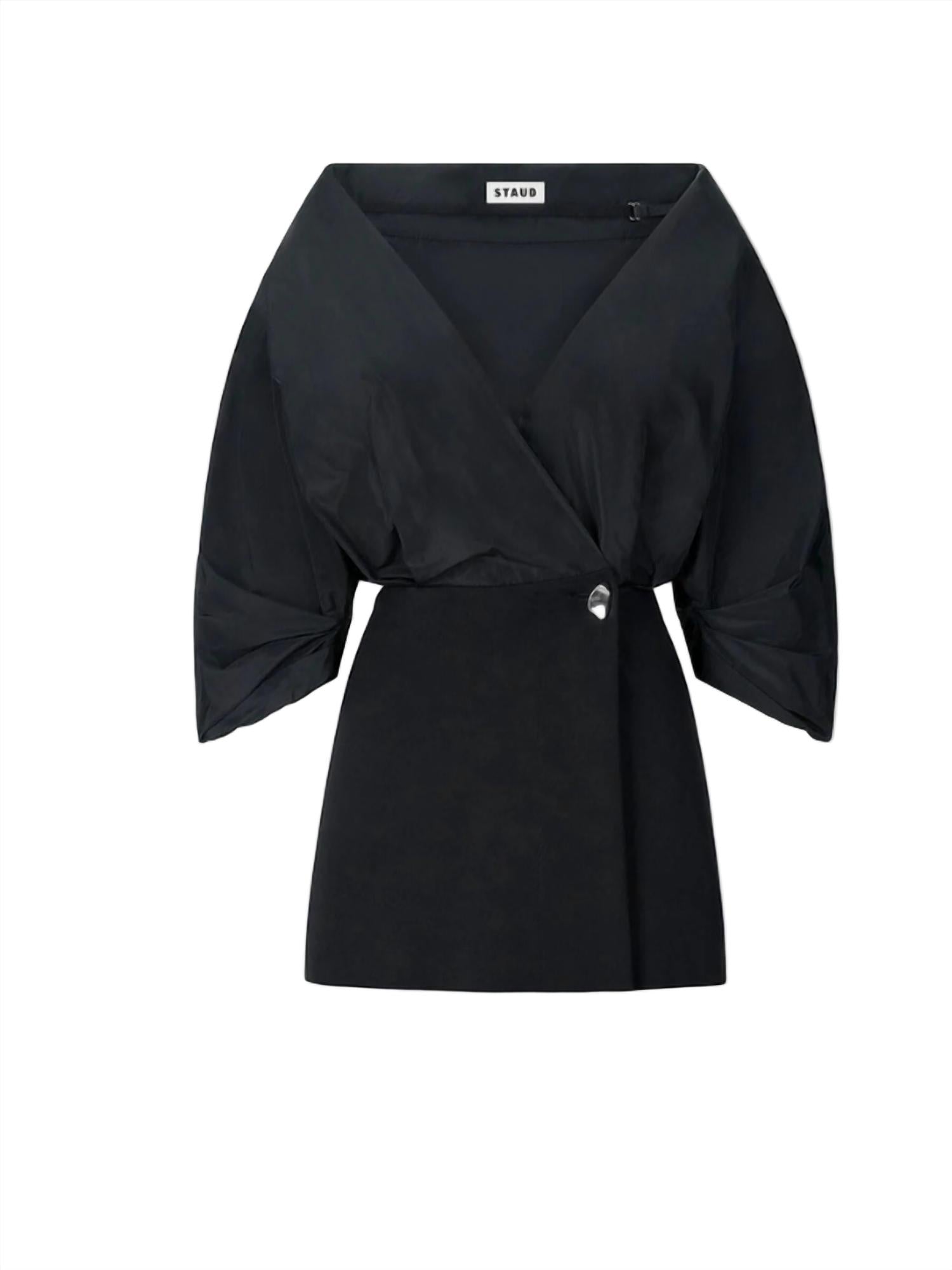 The perfect mini dress for those warmer months. Introducing the Orion Dress by STAUD, a minimalist cocktail party essential in classic black. This mini wrap dress showcases sculptural three-quarter sleeves and a deep V-neckline, crafted from a luxe blend of taffeta and ponte. Composition: 100% Polyester, with a core of 67% Rayon, 29% Nylon, and 4% Elastane. Closure: Button closure. Origin: Imported. Care: Dry clean only. Perfect for the fall season, offering a sophisticated touch to any event.
