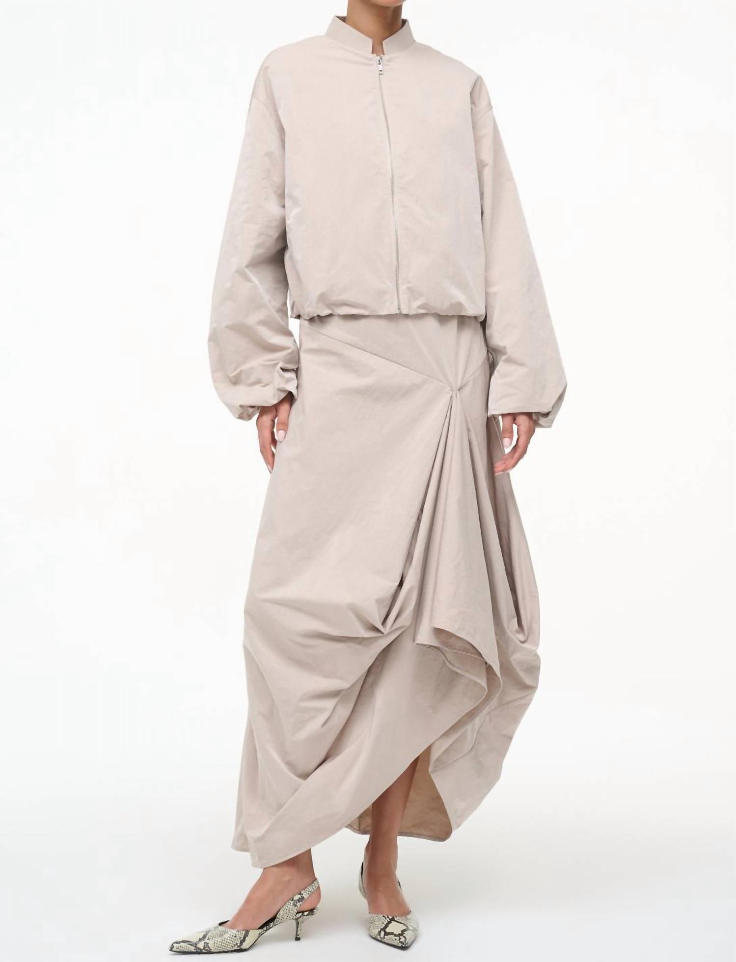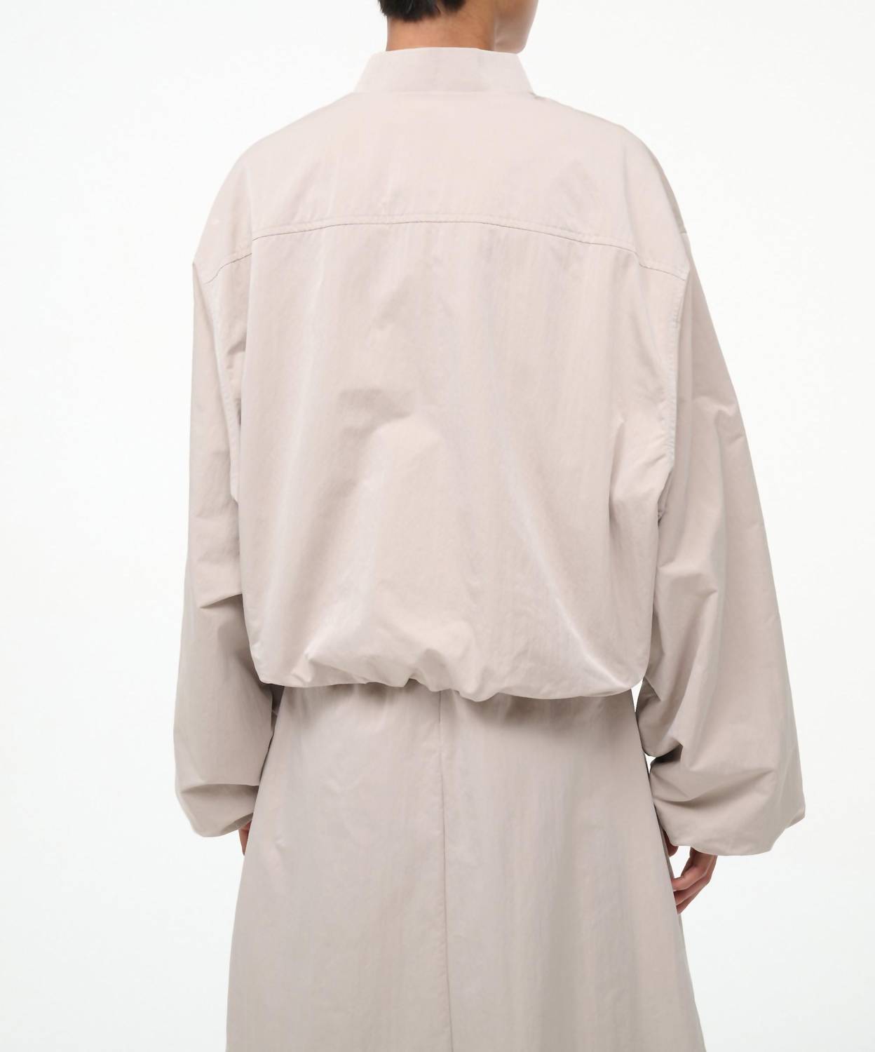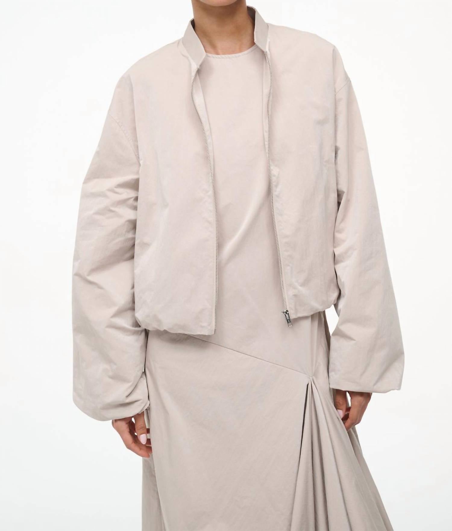 Cute, casual, and comfortable. This jacket is a must have. The Saguaro Jacket by STAUD is a stylish bomber style jacket in a warm Fawn color that's perfect for the Fall season. Crafted from a soft 35% nylon, 35% polyester, and 30% cotton blend, it features long balloon sleeves with elastic cuffs and an elastic waist for a comfortable, oversized fit. With practical front pockets and a secure double zip closure, this lined jacket offers both functionality and style. Care for this solid pattern beauty by opting for dry clean only.