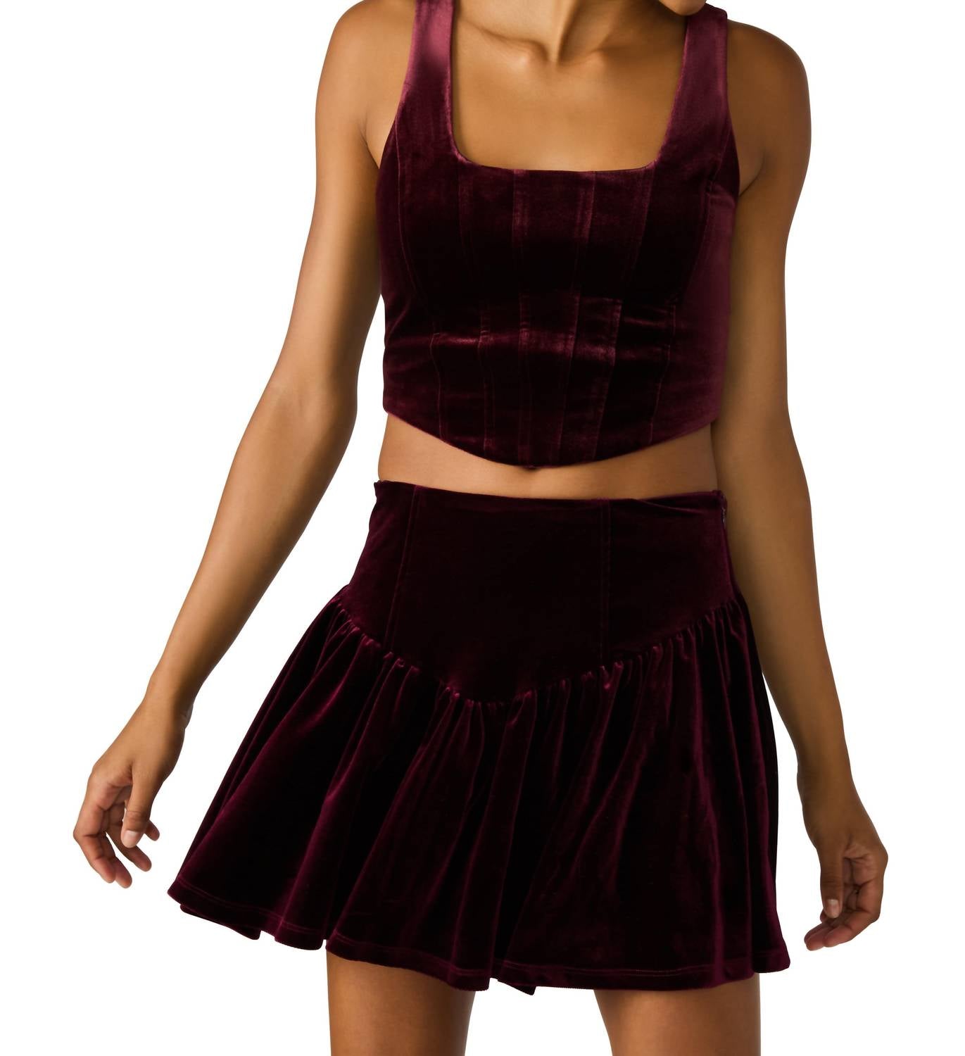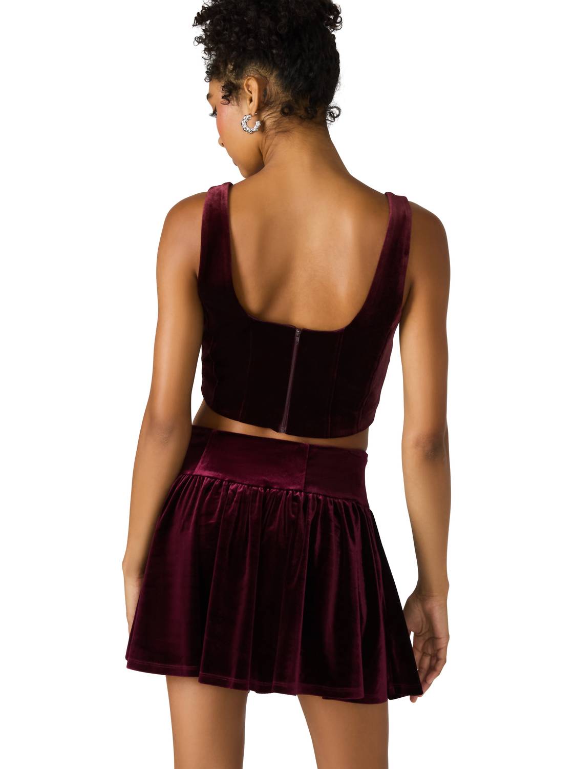 Pair this crop top with your favorite high-waisted jeans or maxi skirt. Elevate your ensemble with the Aryanna Sleeveless Top by Steve Madden, a chic addition perfect for summer festivities. This cropped silhouette in a rich wine hue is meticulously crafted from 93% Polyester and 7% Spandex, ensuring a plush velvet texture. The clean back zipper closure offers a seamless fit, complemented by a scoop neckline for a modern finish. Care for it with a hand wash and line dry to maintain its minimalistic allure.