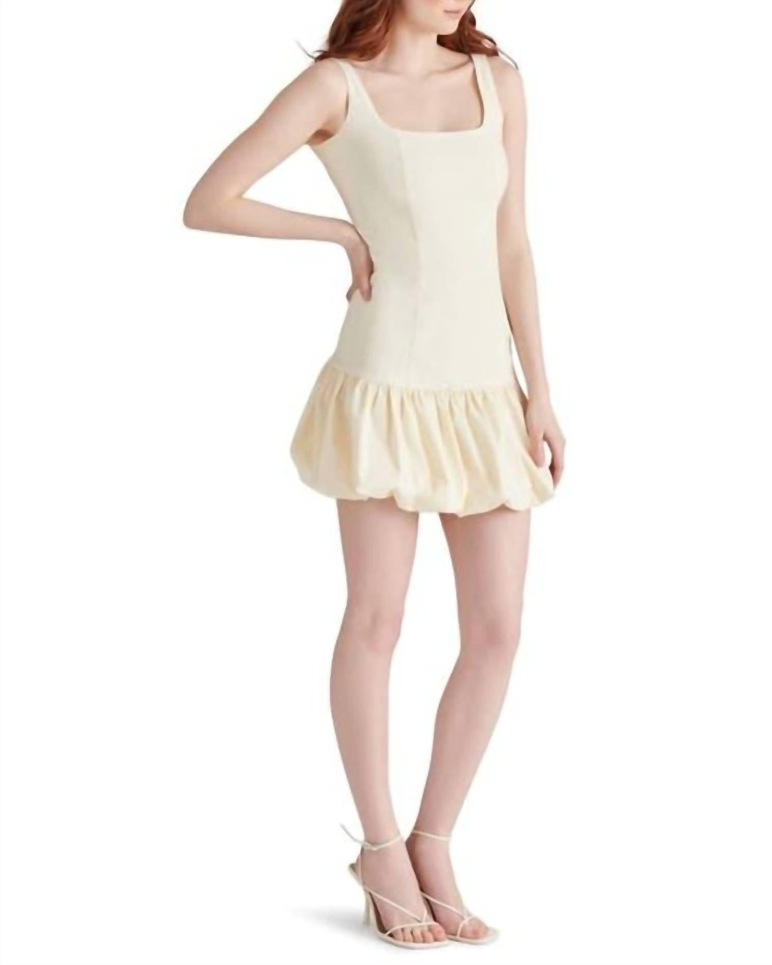 The kind of easy and flattering dress you'll be reaching for all season long. Introducing the Ravenna Dress by STEVE MADDEN, perfect for a cocktail party or as a stunning graduation dress. This sleeveless design features a modern square neck and a chic bubbled drop-waist silhouette, crafted in a breathable blend of 75% rayon, 22% nylon, and 3% elastane. Complete with a hidden side-zip closure, the dress boasts a lined interior in antique white, measuring 33 1/2" in length for a flattering mini fit. Care for it with a gentle hand wash and lay it flat to dry for long-lasting wear.
