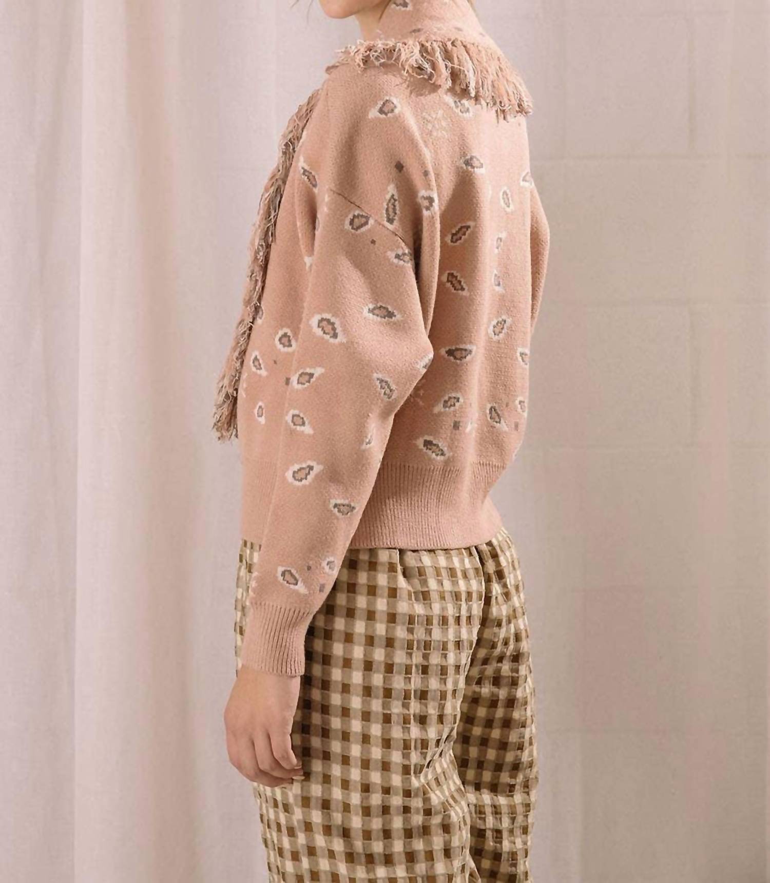 Throw this adorable cardigan over any cami or tank top. Introducing the Paisley Fringe Knit Cardigan by STORIA, a standout piece perfect for your spring holiday gatherings. Crafted with long sleeves and a chic notched collar, this peach cardigan features a playful paisley and heart print, enhanced with fringed yarn detailing on the collar for added flair. With a convenient button closure, it embodies the maximalist trend while offering effortless elegance. Care for this patterned cardigan by hand washing and laying flat to dry, making it an ideal choice for Thanksgiving and other holiday parties.