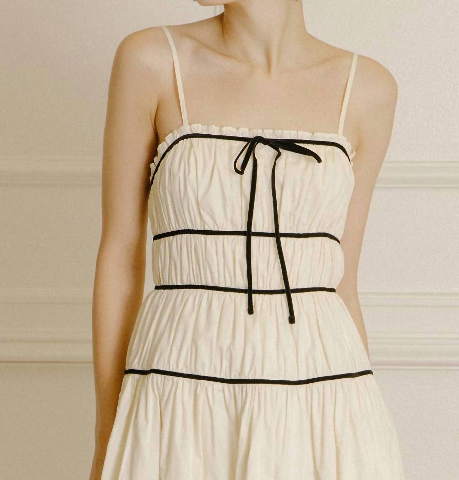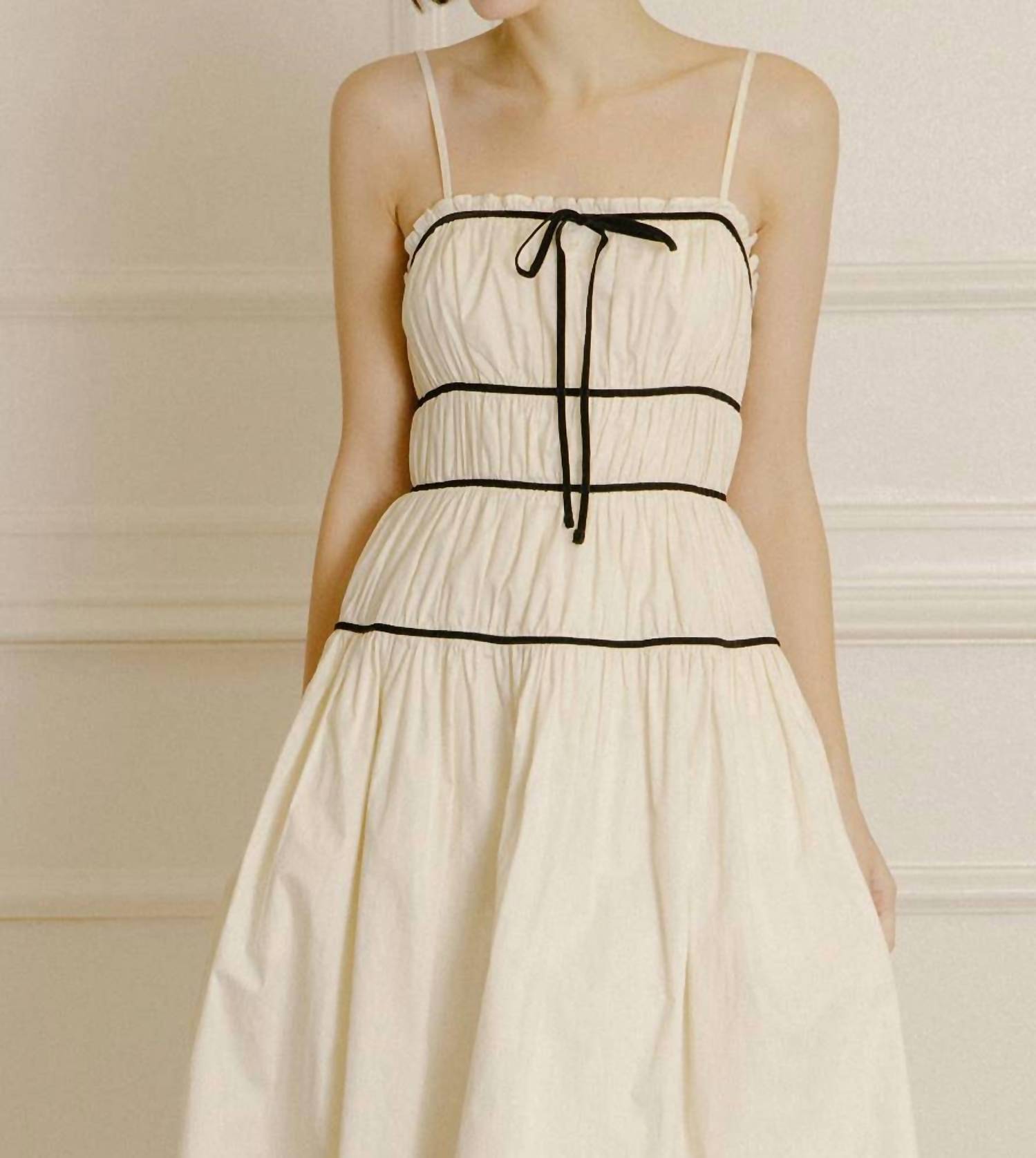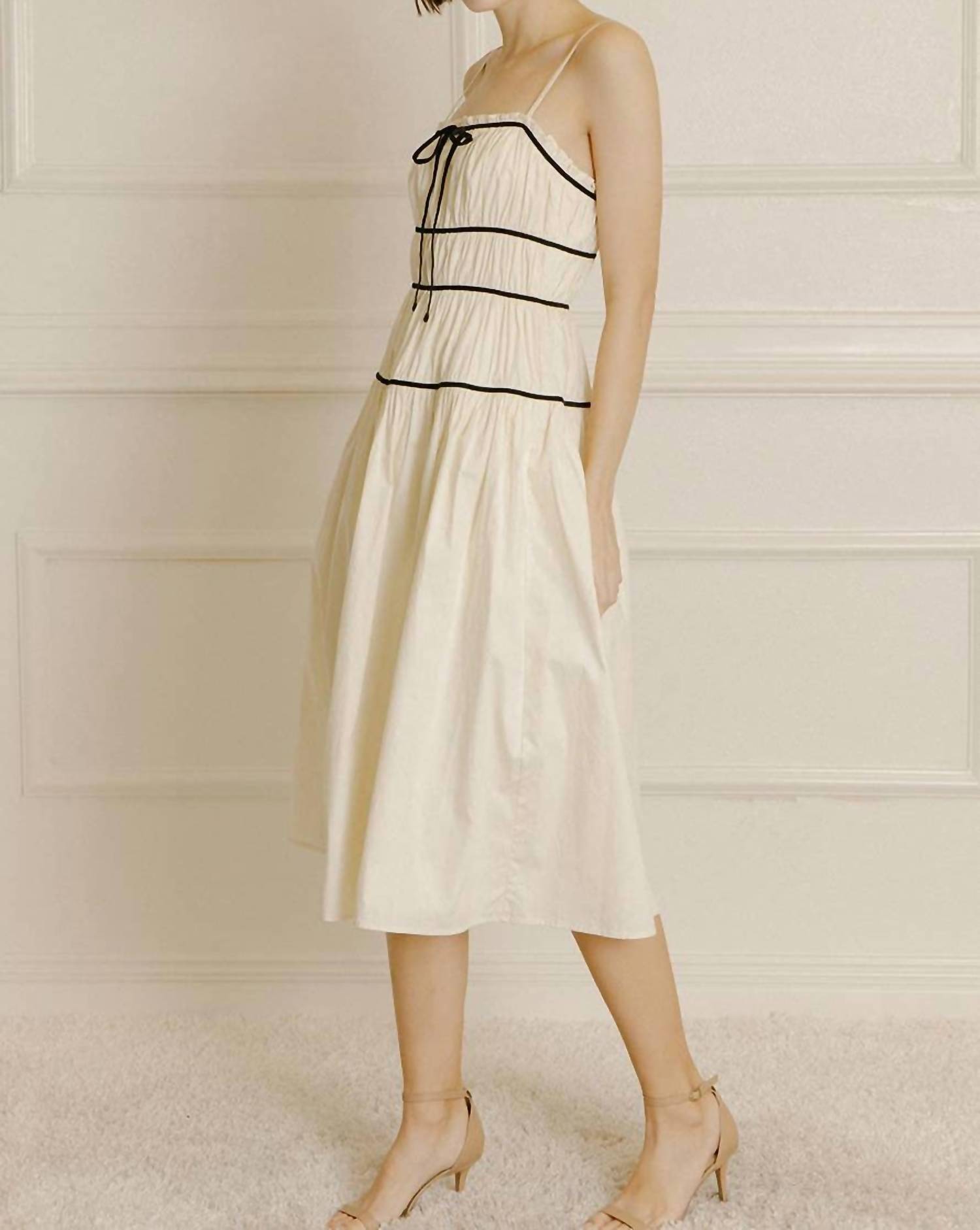 Just add slides or mules and you are good to go. Discover the charming Stella Midi Dress by STORIA, crafted for summer occasions like holiday parties. This fit and flare dress in chic beige features adjustable spaghetti straps, a square neckline, and a stylish center-bust bow detail. Made from 100% comfortable cotton, it flaunts a monochromatic look with contrast lining and rows of gathering details for added elegance. Practical and effortless, it offers a zip closure and is easy to care for with machine wash and line dry instructions.
