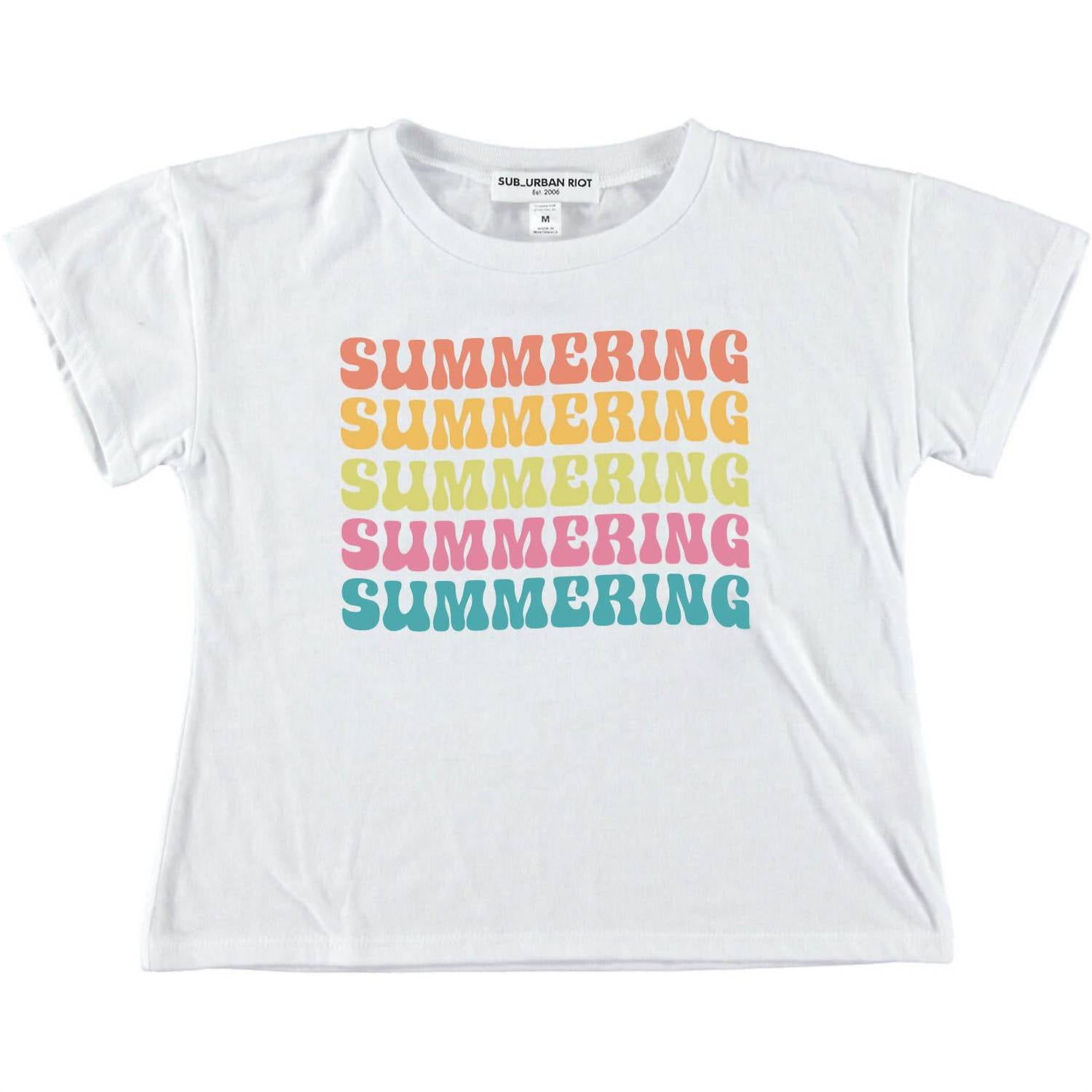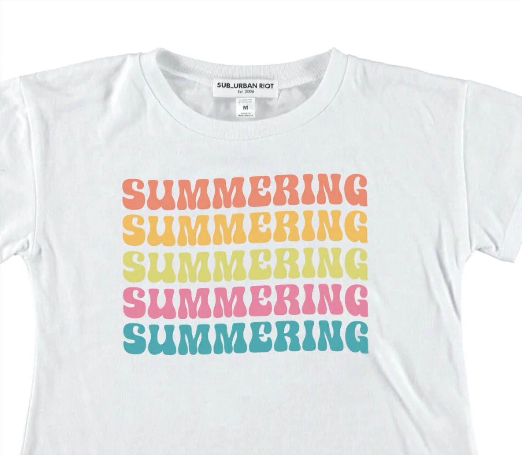 Presenting the Girl's Summering Boxy Tee by Suburban Riot, a delightful addition to your summer wardrobe with its fun graphic design. This short sleeve, white tee is crafted from a soft cotton-blend featuring a mix of 50% polyester, 25% cotton, and 25% rayon for a comfortable fit. Designed for girls, this cropped top is pre-washed and easy to care for with machine wash and low tumble dry instructions. Perfect for casual days, this tri-blend jersey tee combines style and ease effortlessly.